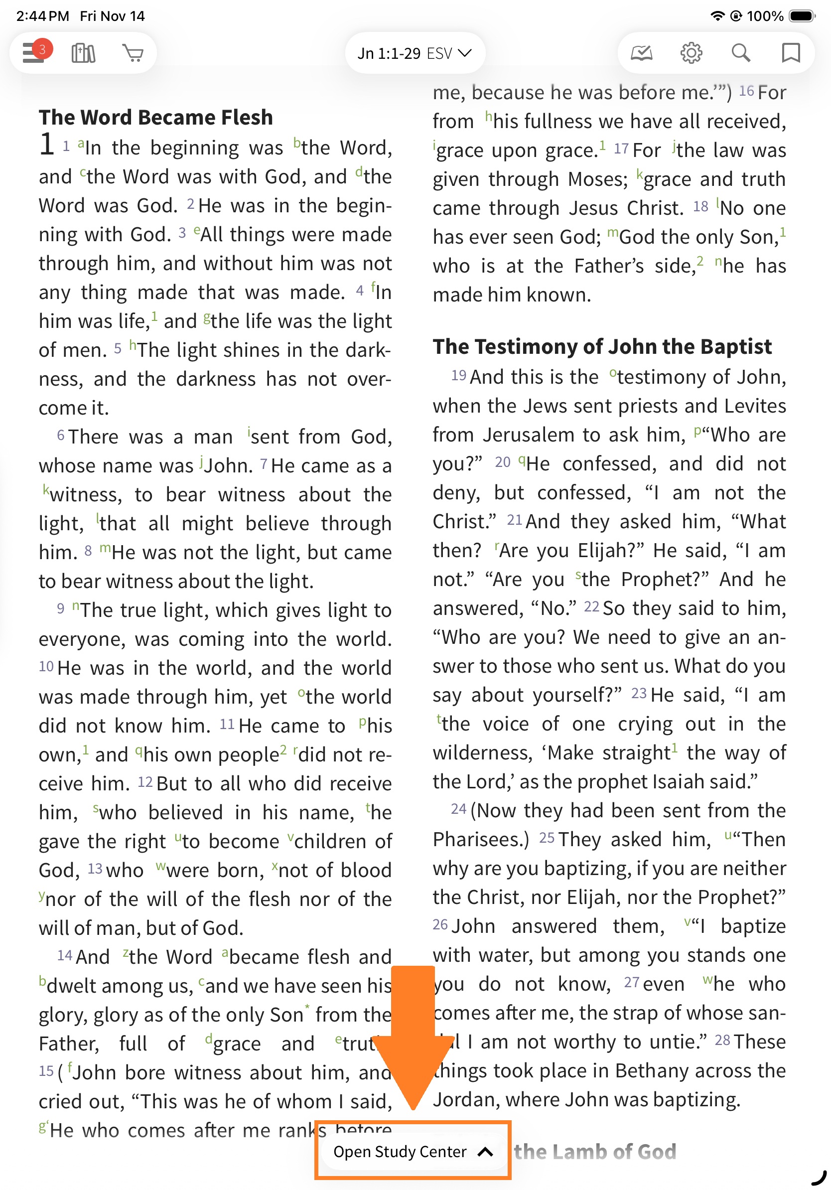 First, open any Bible of your choosing and select the green 'Open Study Center' tab.