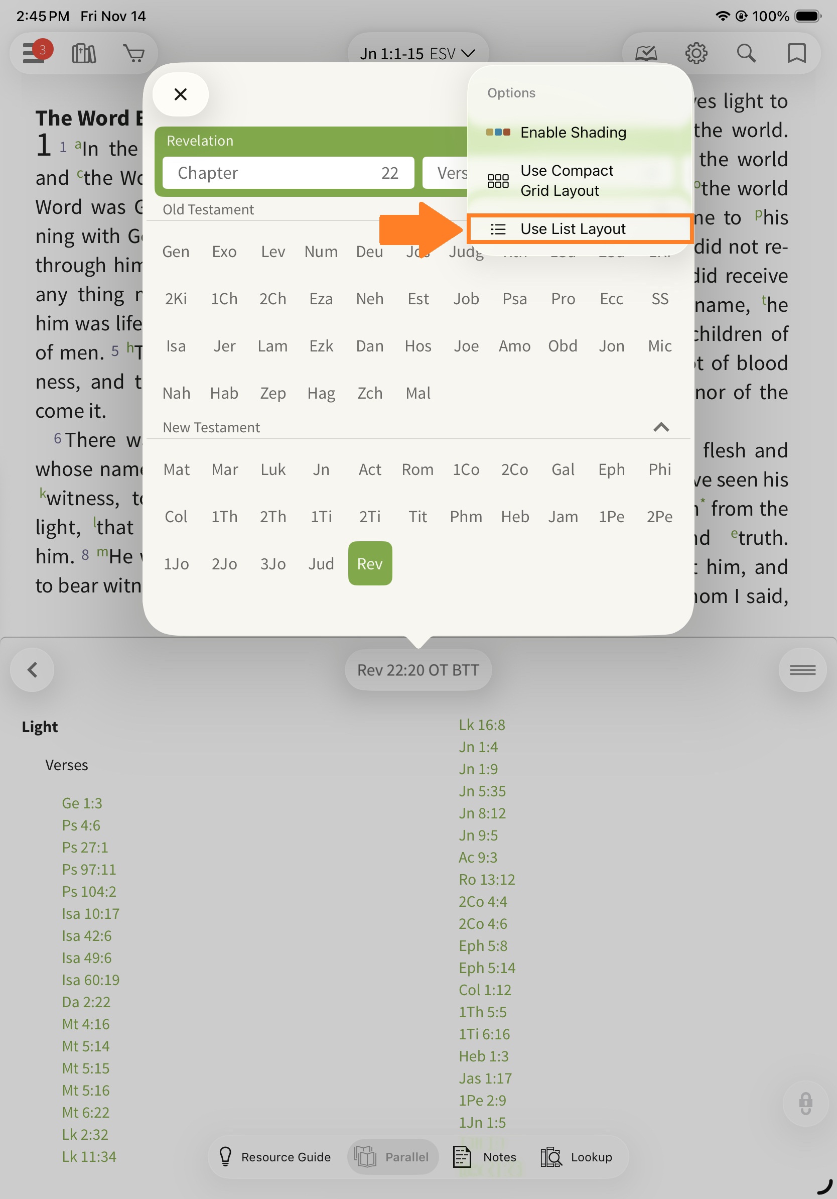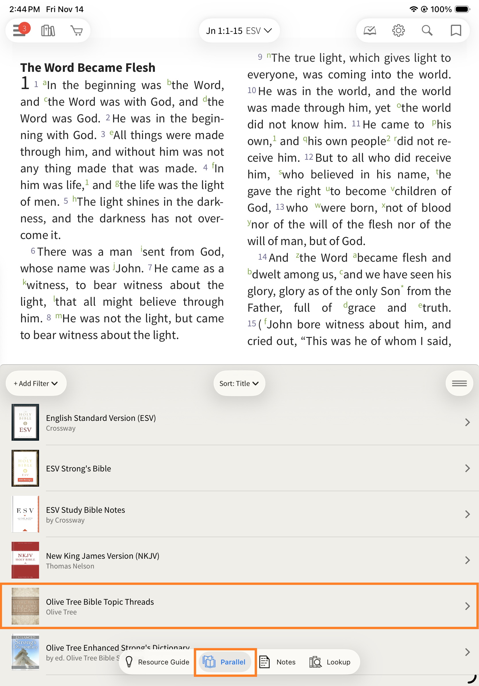 Next, select the Parallel option and choose the Olive Tree Bible Topic Threads from the list to open it in the split window.