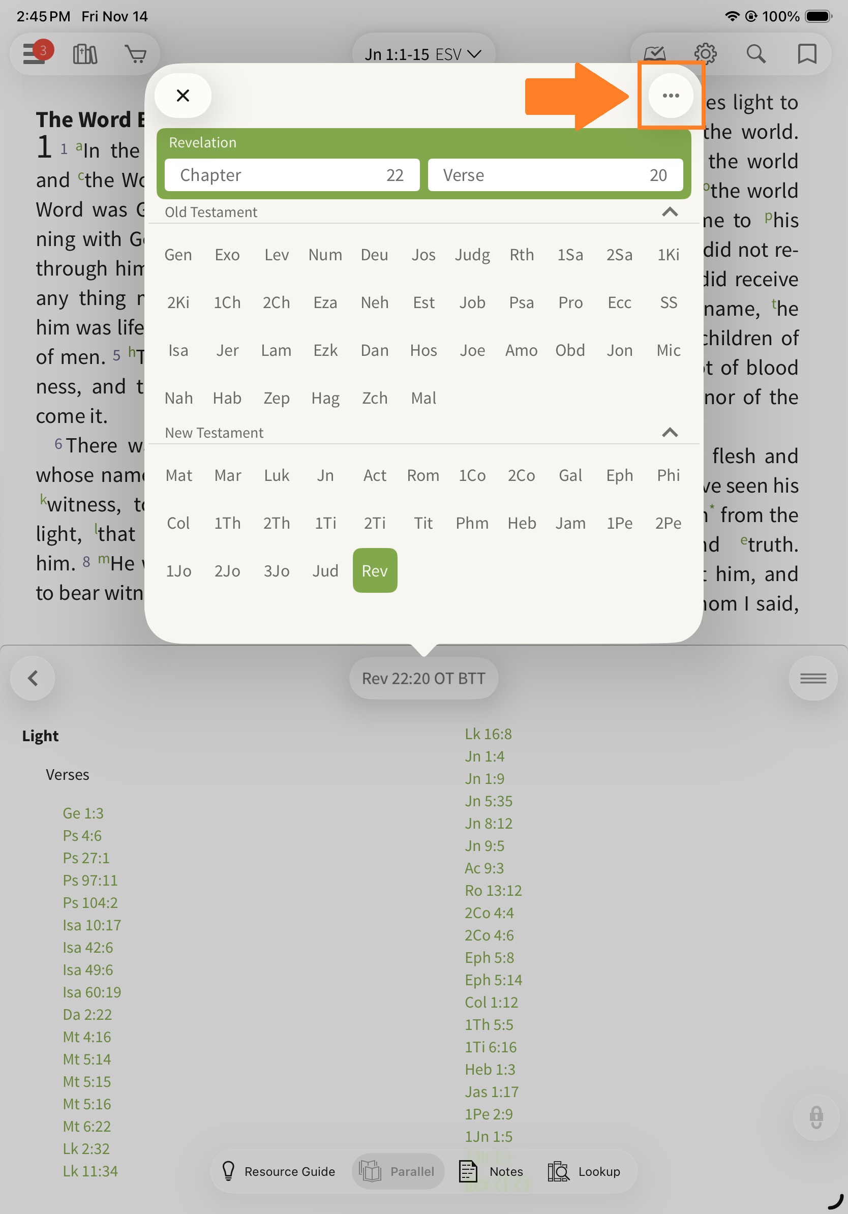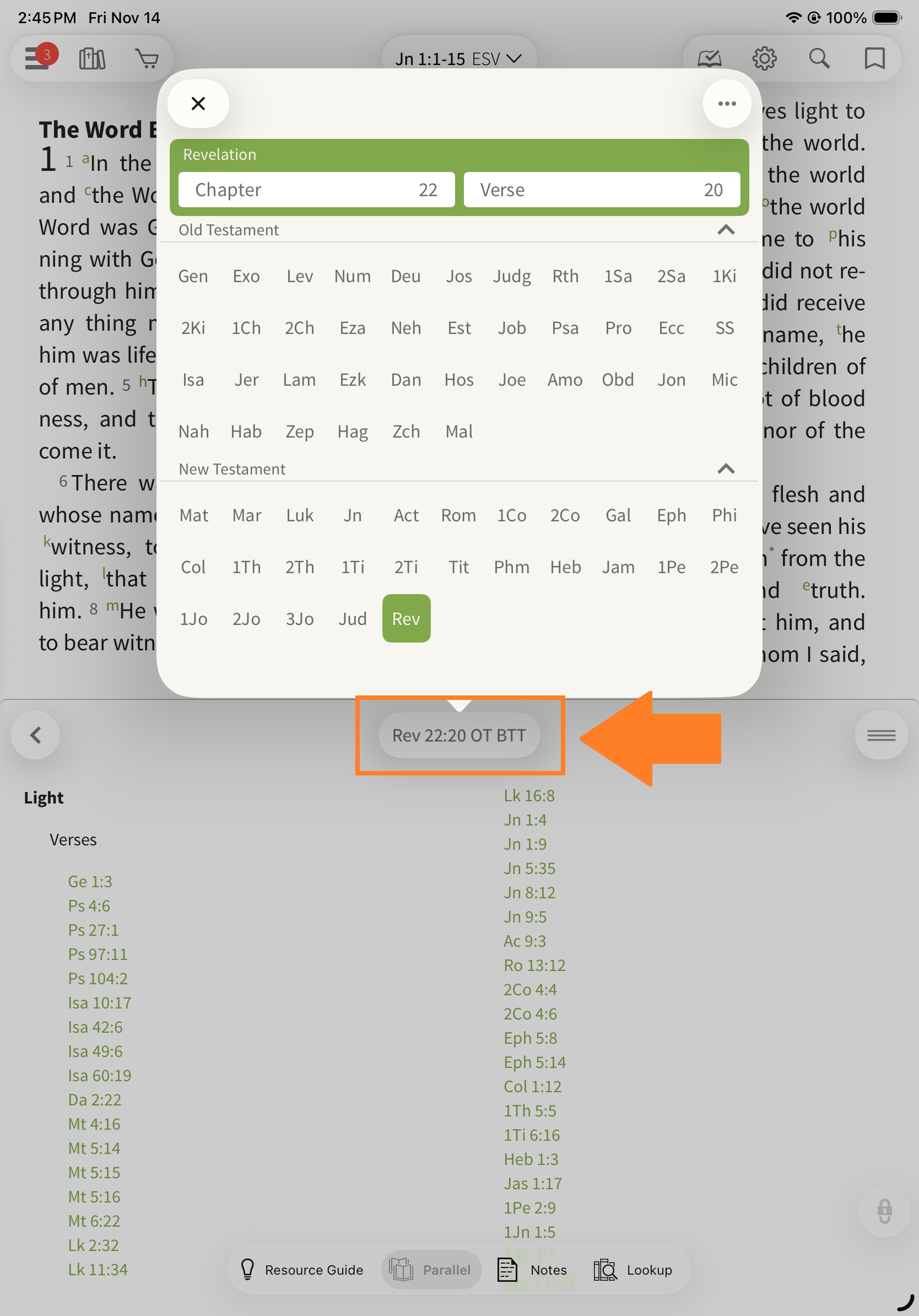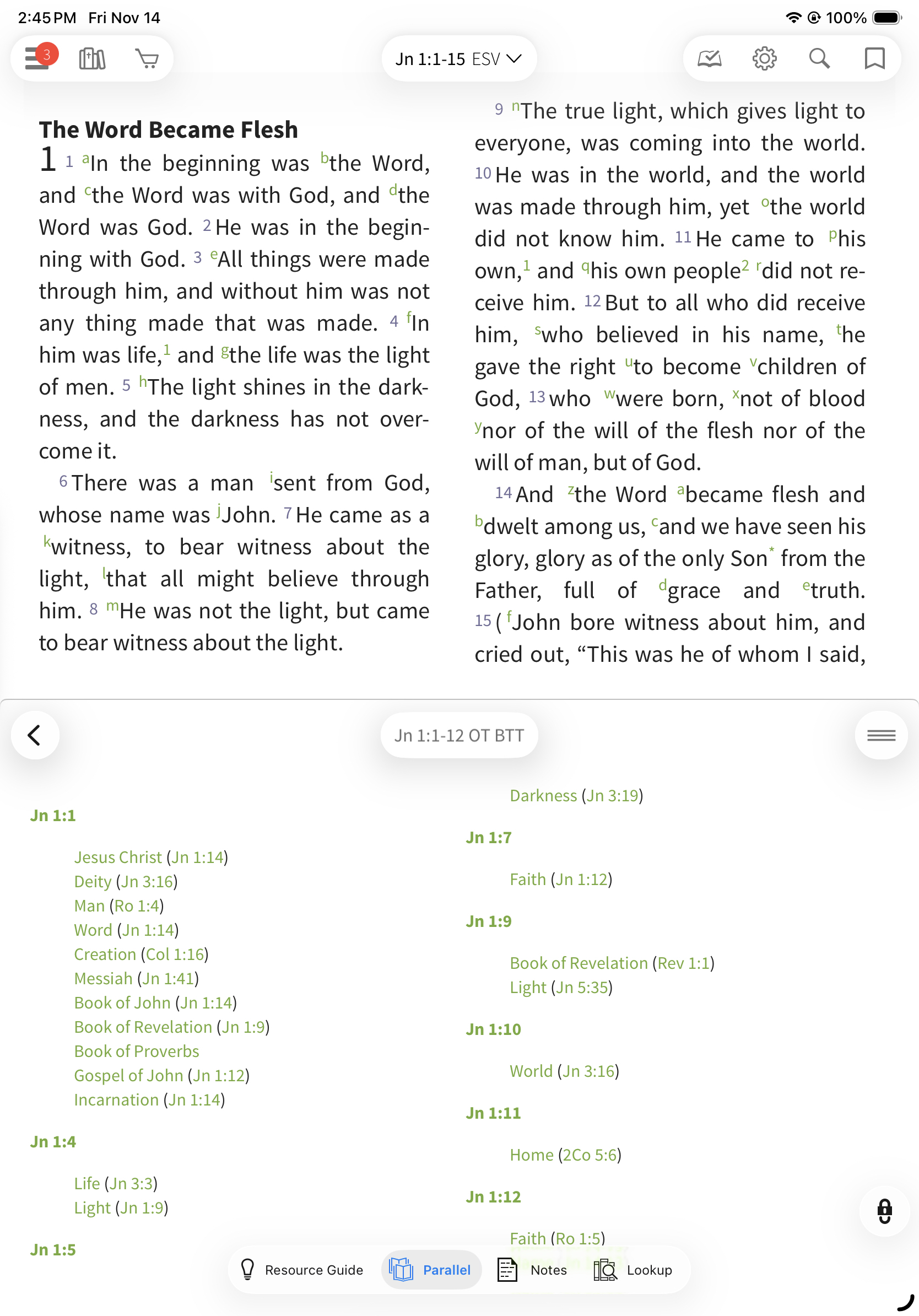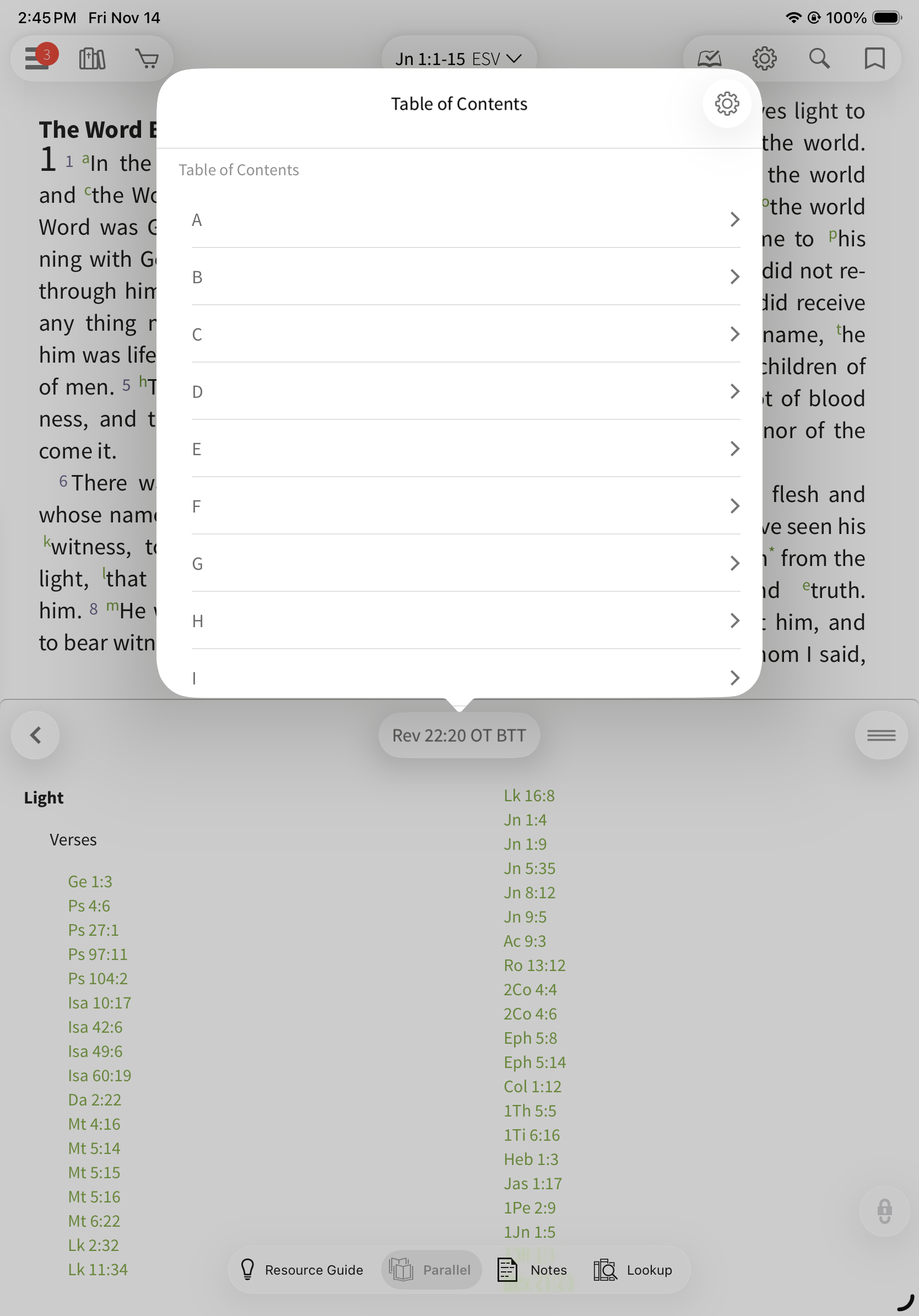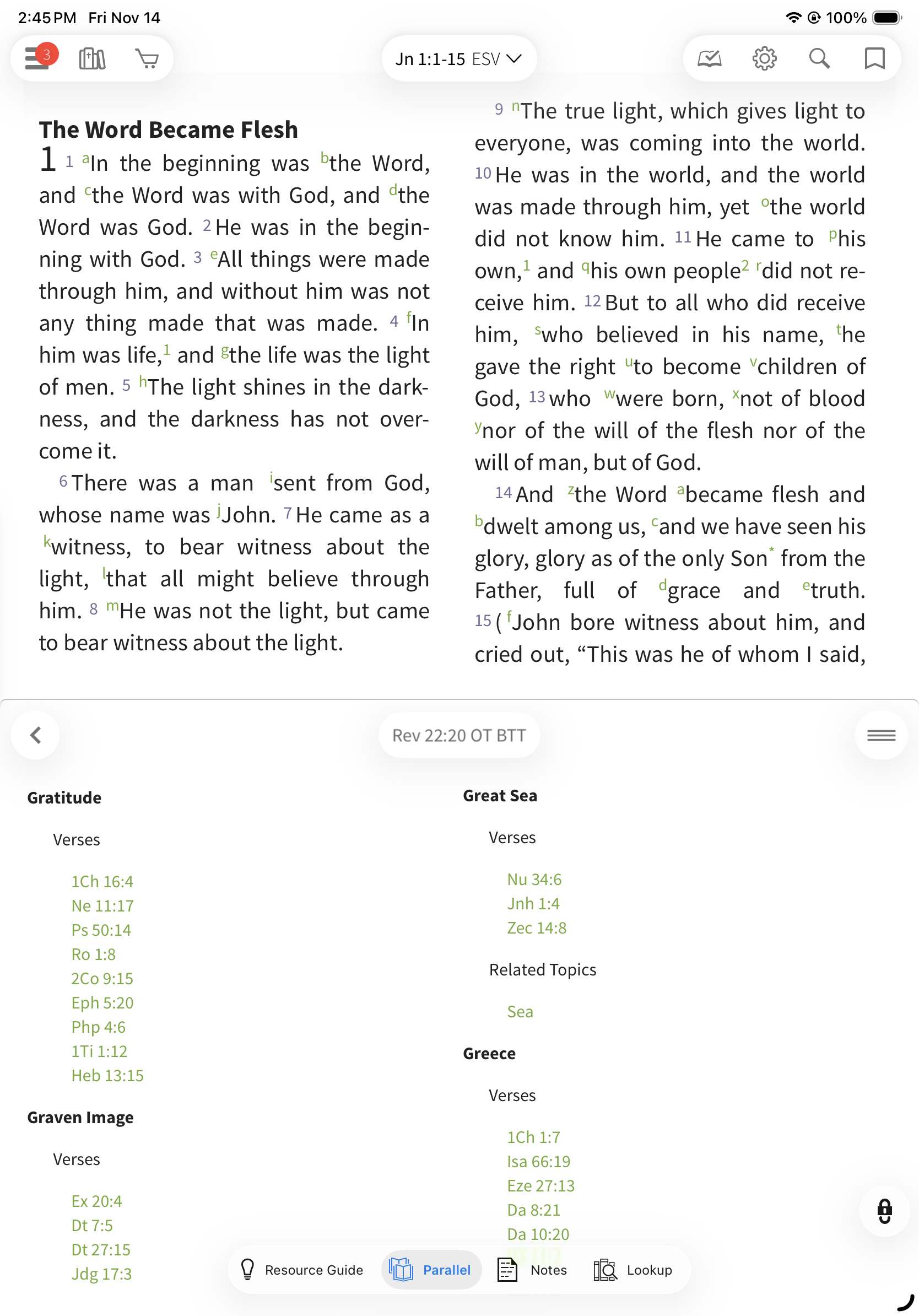 When opened in Parallel, the Olive Tree Bible Topic Threads will follow the text you have open in the main window and pull up cross references and thematic topics. You can tap on the verse to read it in a pop-up window or tap the particular theme (e.g. Ethics) to view a more comprehensive list.