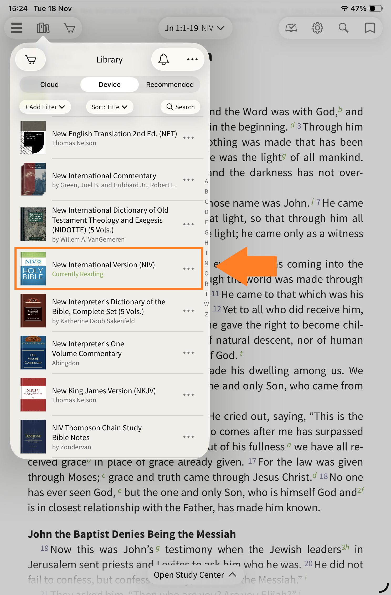 One way to view the study notes in the app is through the Resource Guide. First, open the New International Version (NIV) in the main window. Tap the Library icon and choose the Bible from the list of downloaded resources.