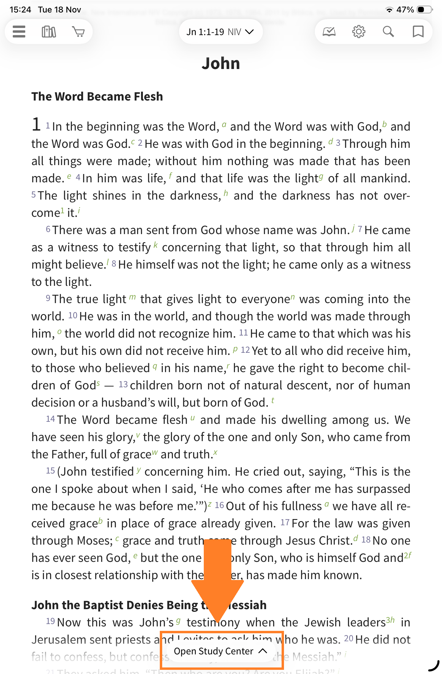Next, tap on the green bar at the bottom of the screen to open the Study Center. If you don't see the green bar at the bottom, tap once in a blank space on the screen.