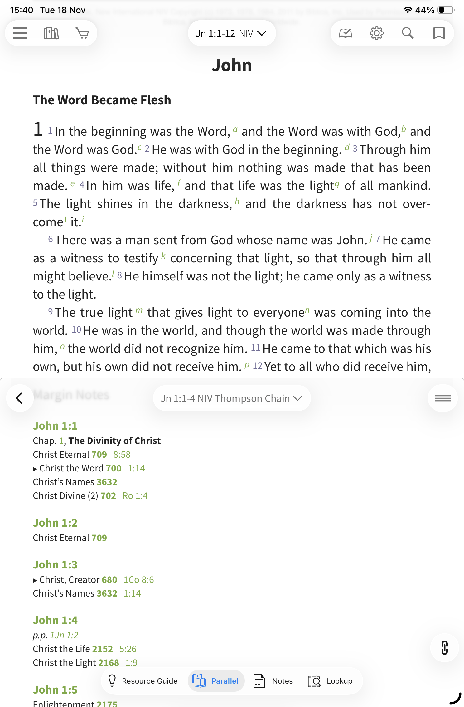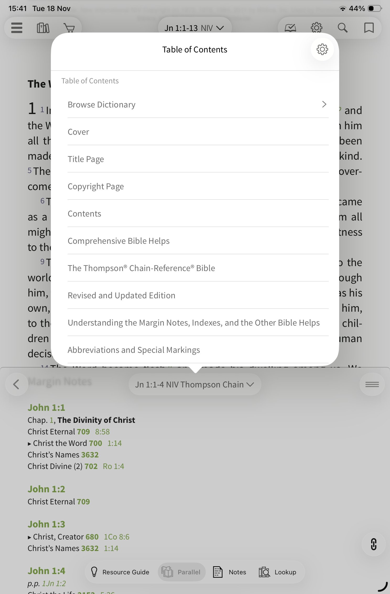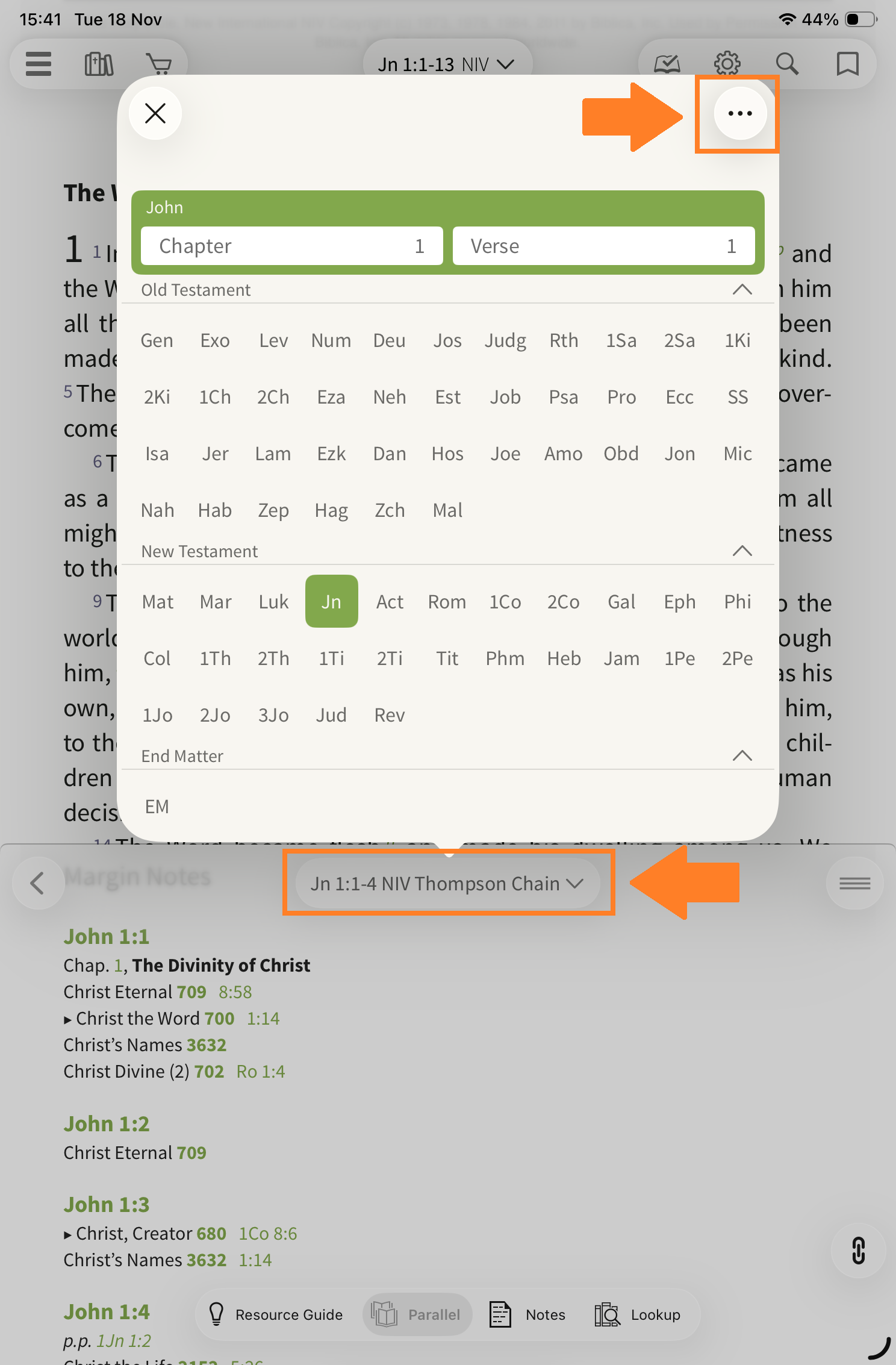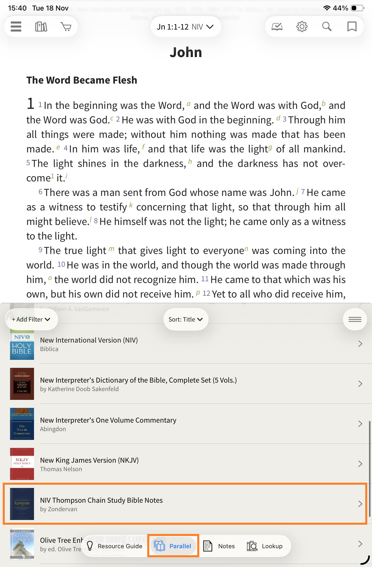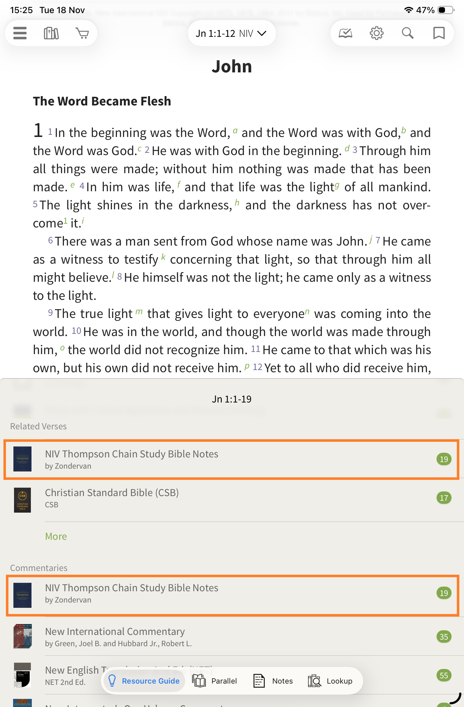 Tap on the Parallel tab and choose the NIV Thompson Chain Study Bible Notes from the list: