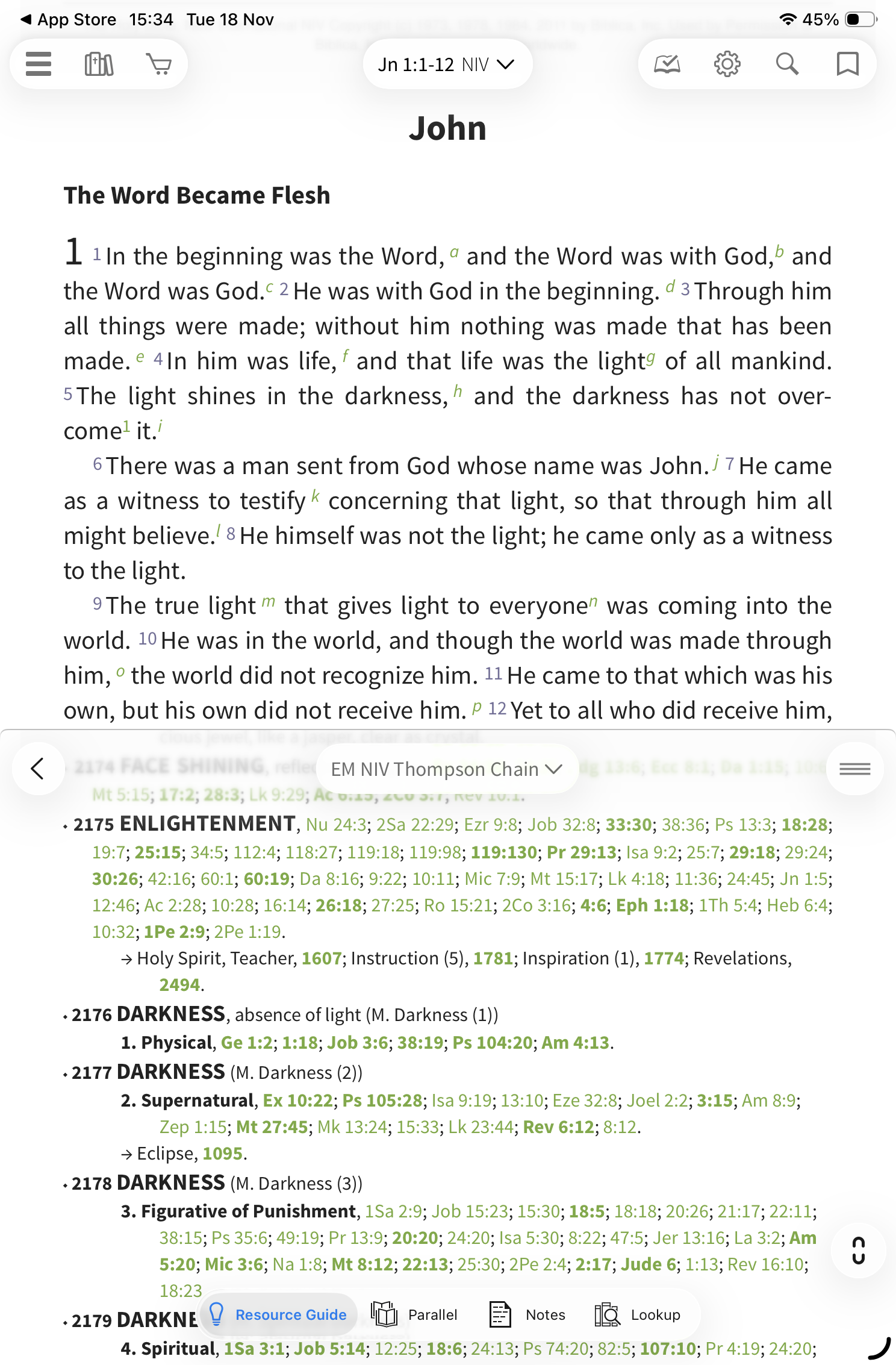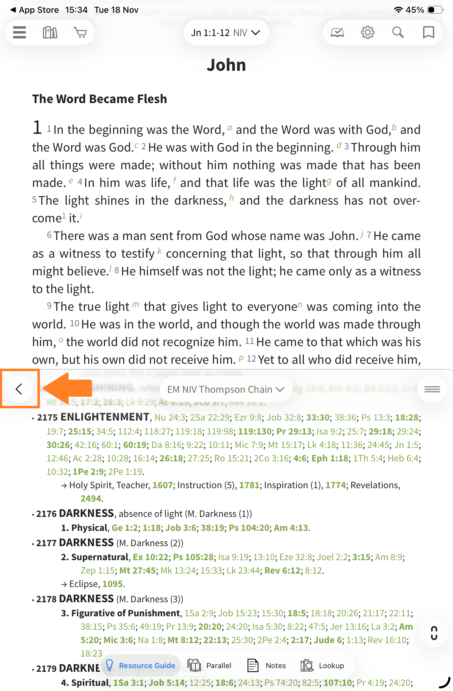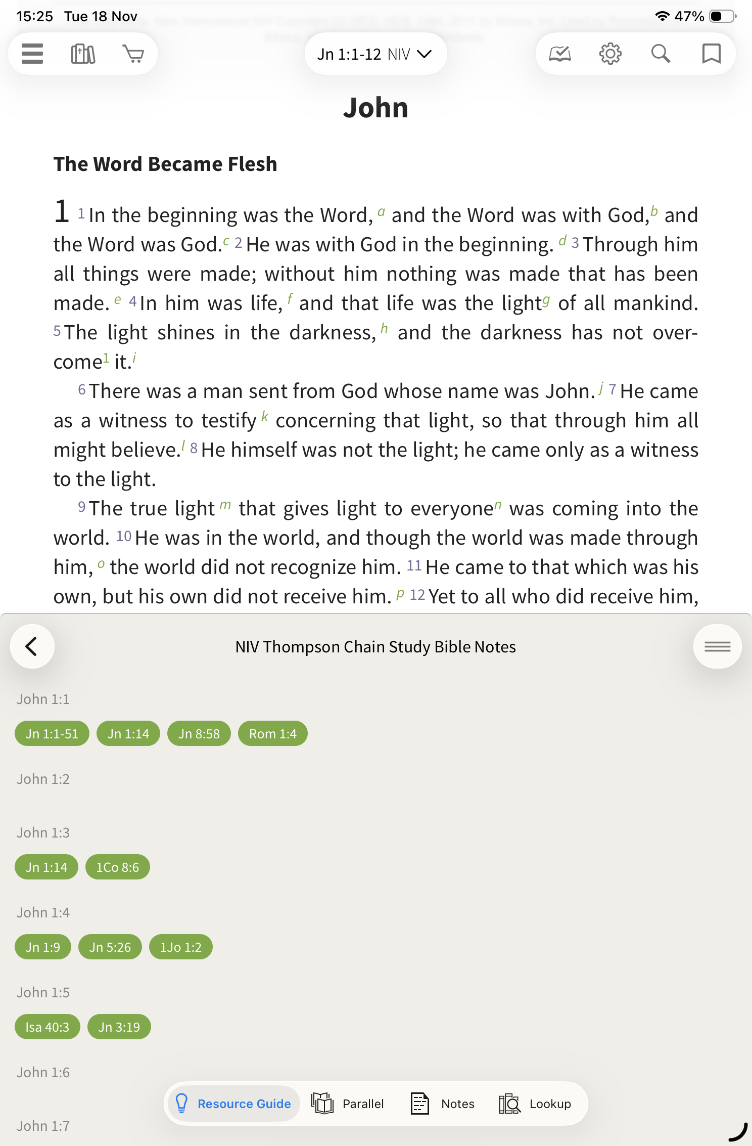 You will see relevant entries from the NIV Thompson Chain Study Bible Notes in the Resource Guide that correspond to your location in the Bible text in the main window.