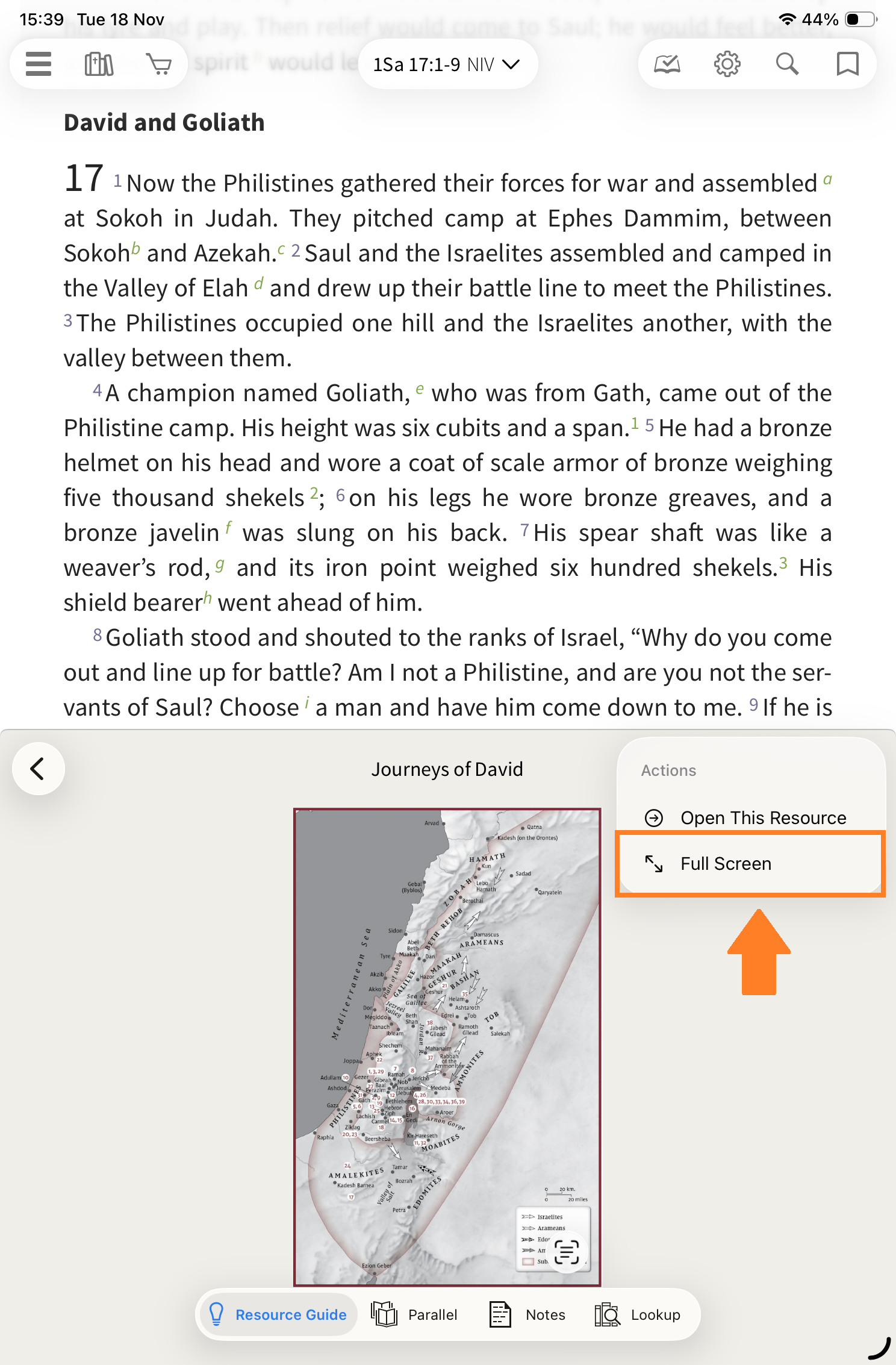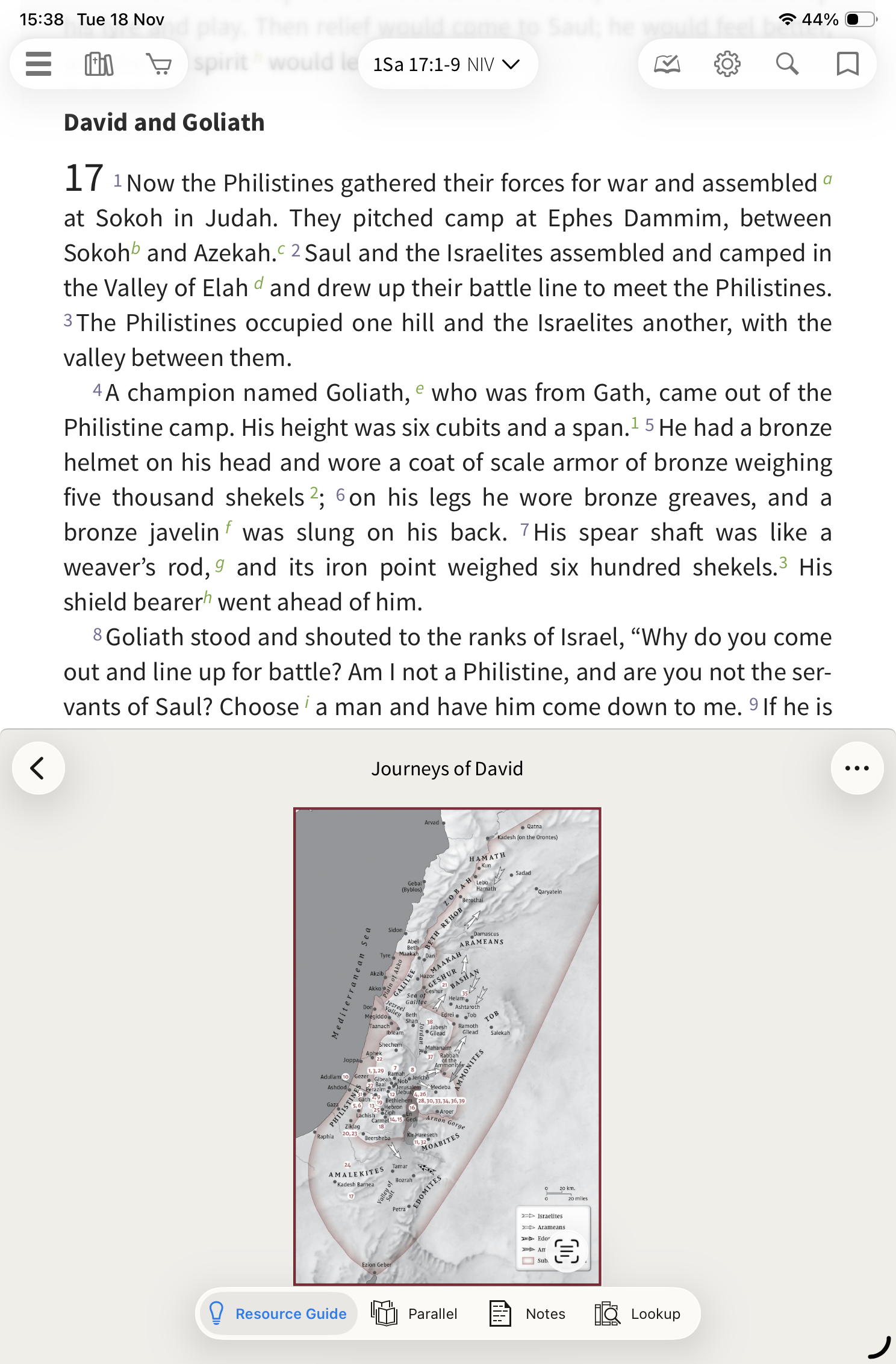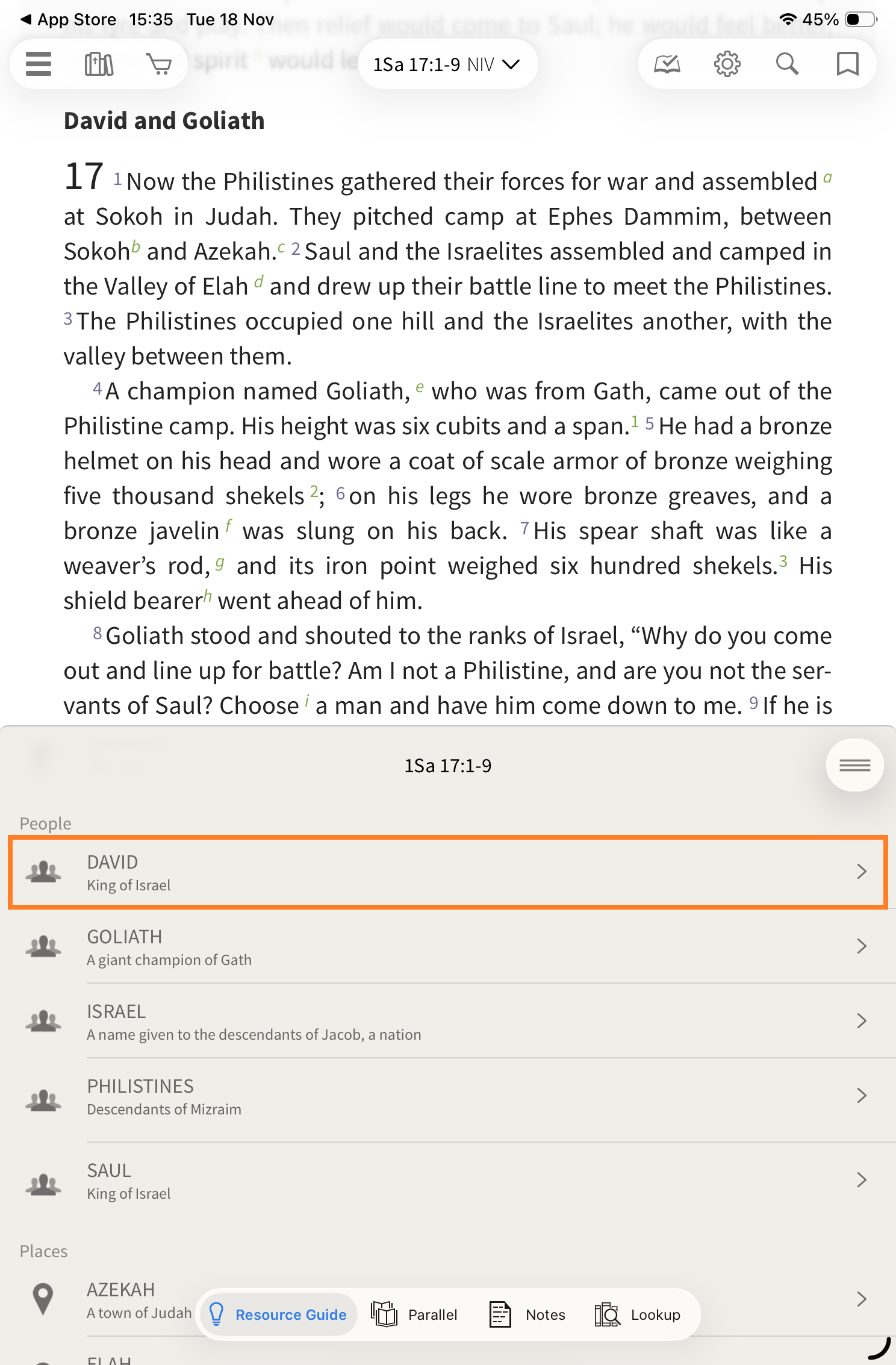 There are also some other gems available that are a little less obvious. For this example, I have moved to 1 Samuel 17:1. In the People section, you will see David listed.