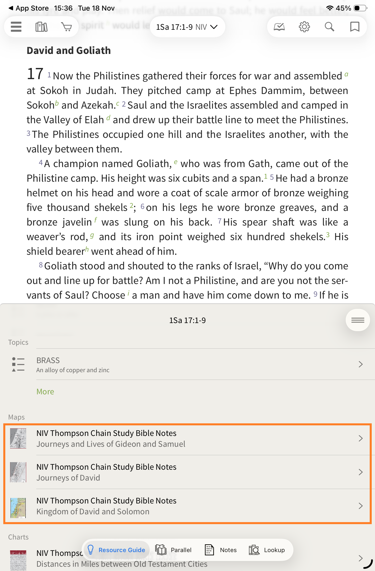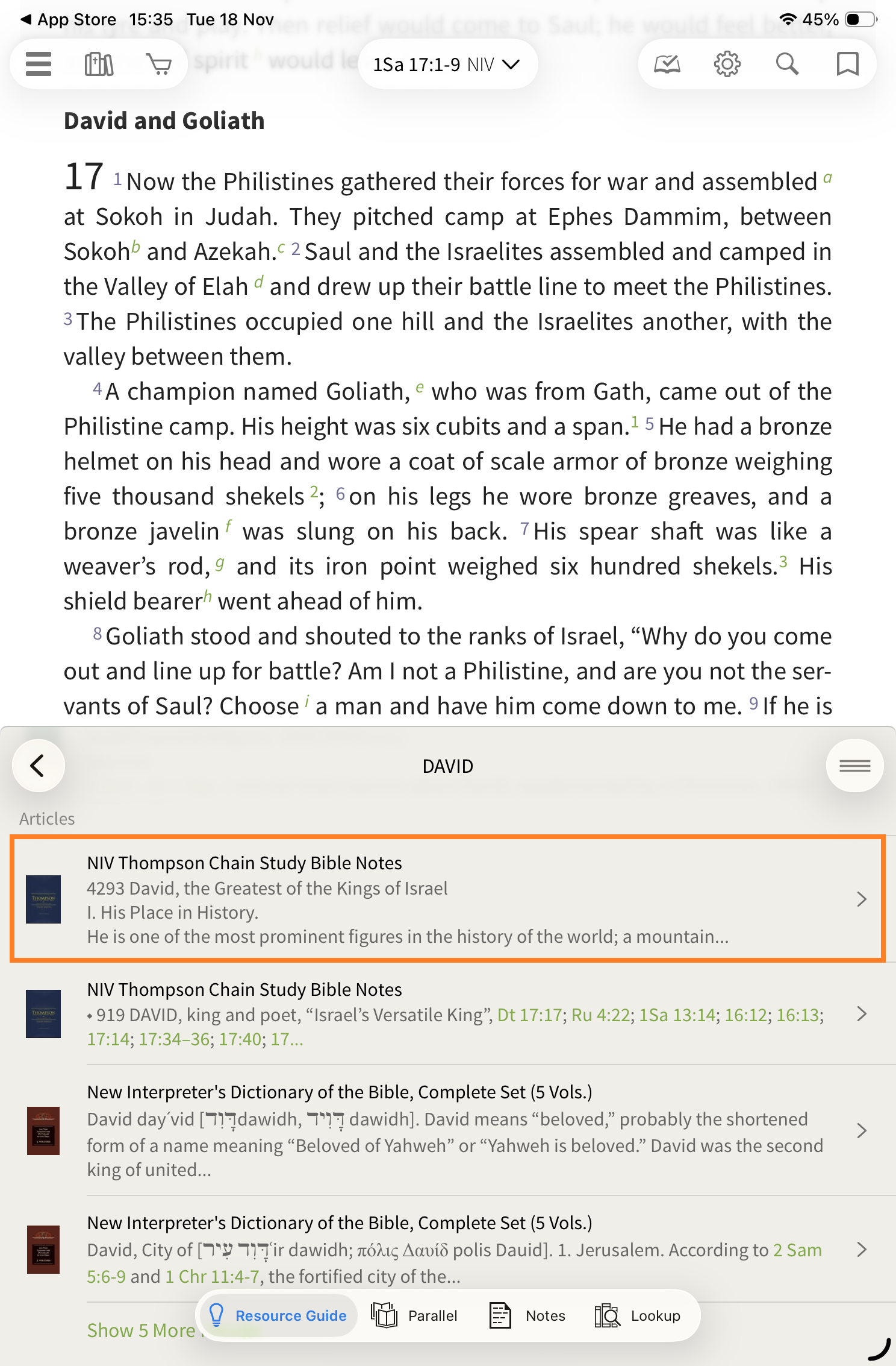 When I tap on 'David', the Resource Guide automatically shows that there is an article on David available in the Thompson Chain resource. Tap on the article to read it.