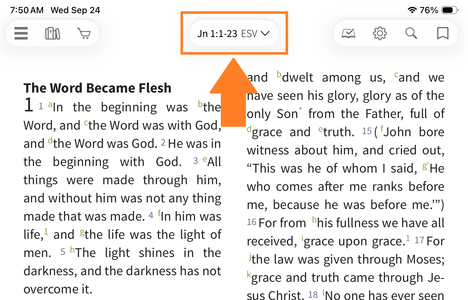 To open the navigation menu, tap the location reference at the top of the screen. This works in both the main window and the Parallel window of the Study Center, whether the toolbar is visible or hidden.