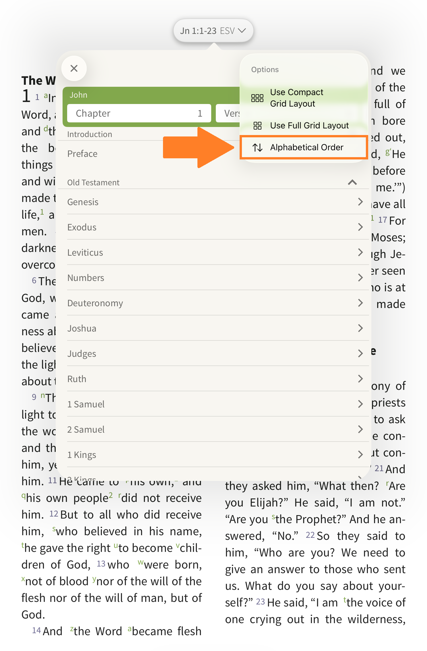 When viewing a Bible in List View, you can sort the books alphabetically. Tap the Options icon and select Alphabetical Order.