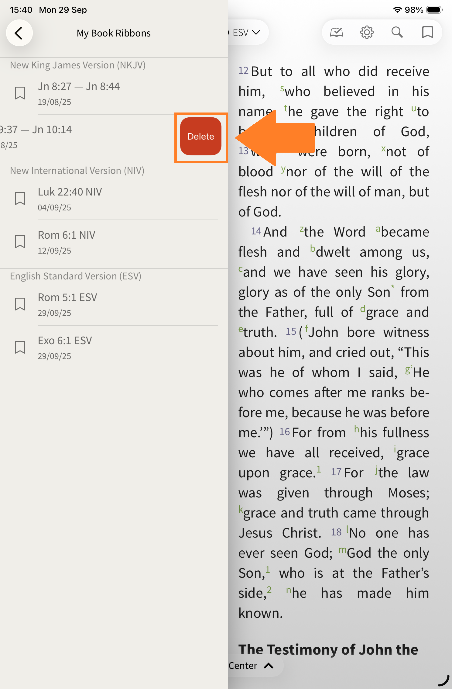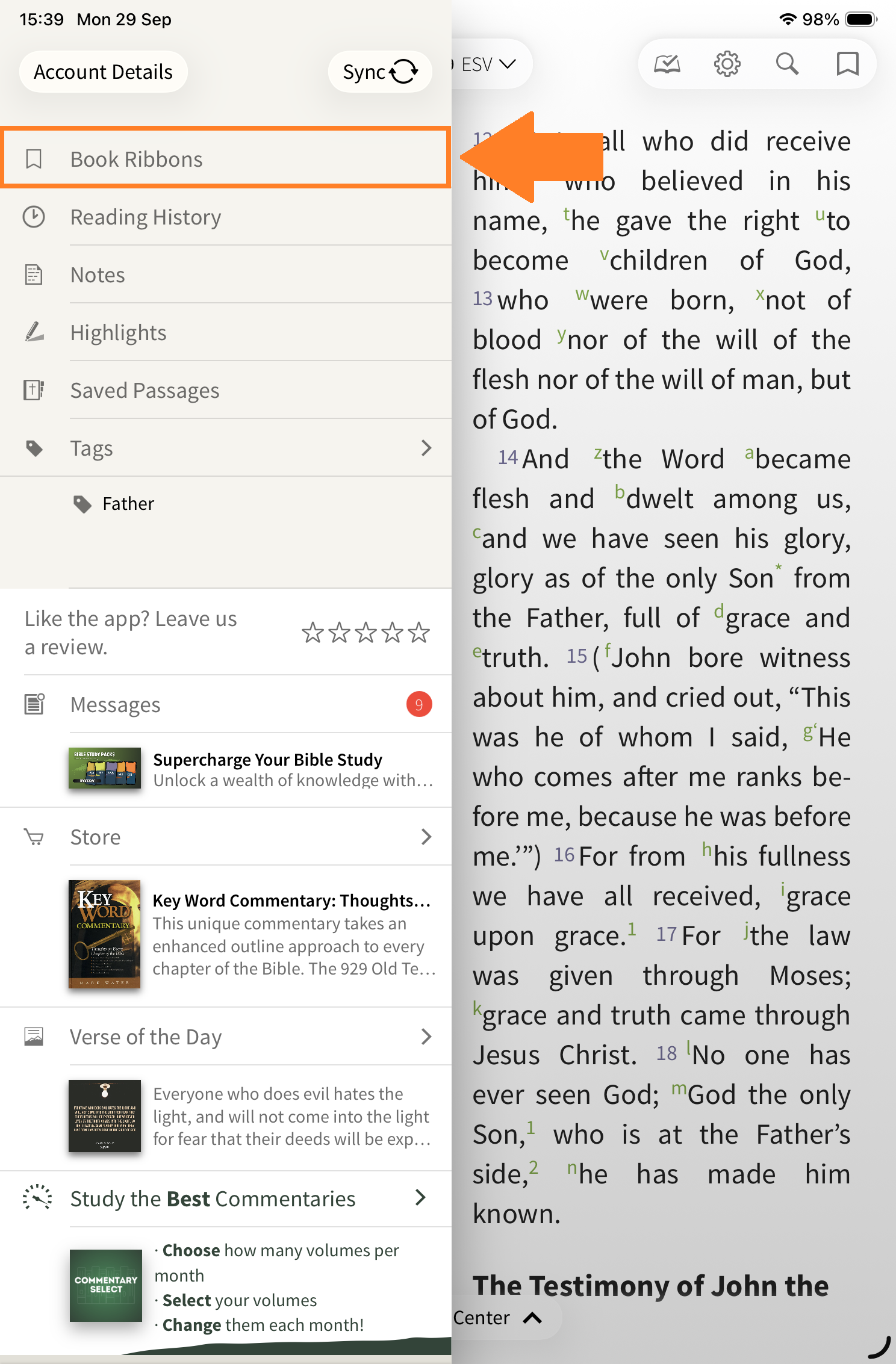 Book ribbons are a great tool for quickly marking a place in the text to return to later. Book ribbons are similar to a ribbon in a physical Bible because they mark an area of text rather than a specific Bible verse or phrase. In this way, book ribbons are different from other annotations like notes, highlights, and saved passages that can be tied to a specific Bible verse or word(s).