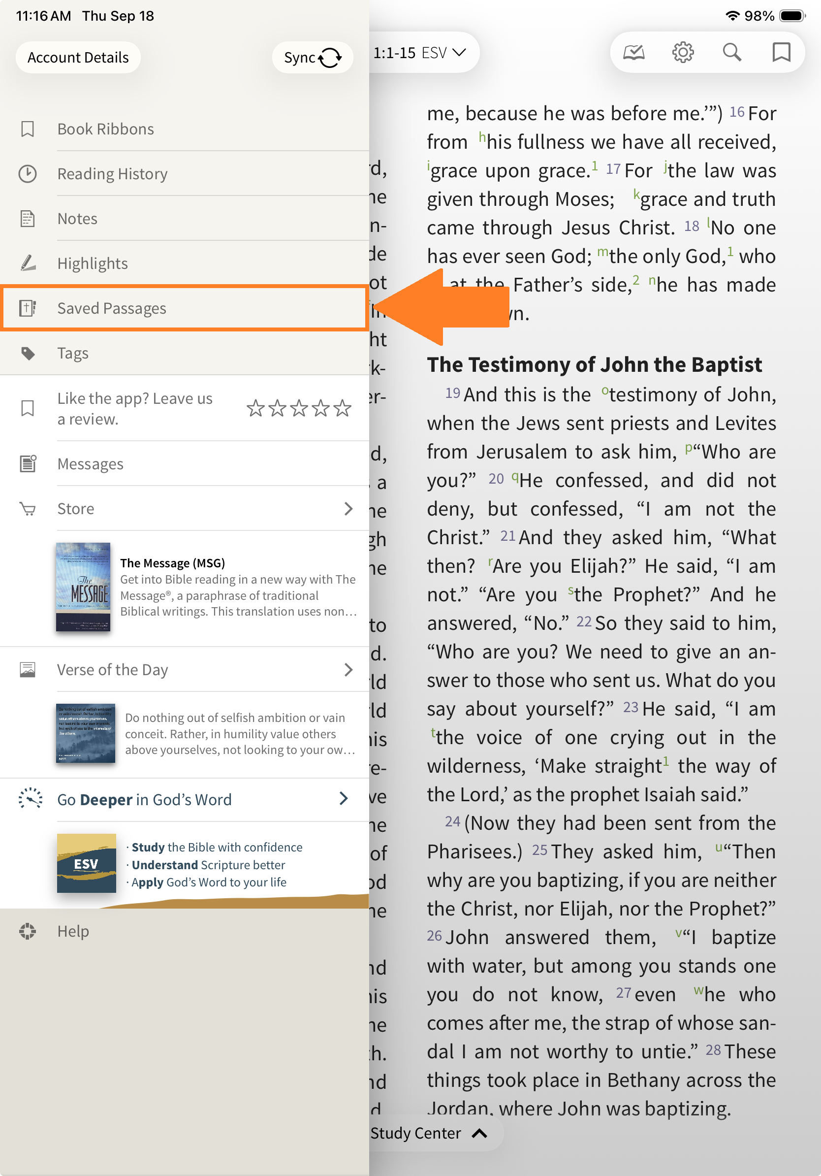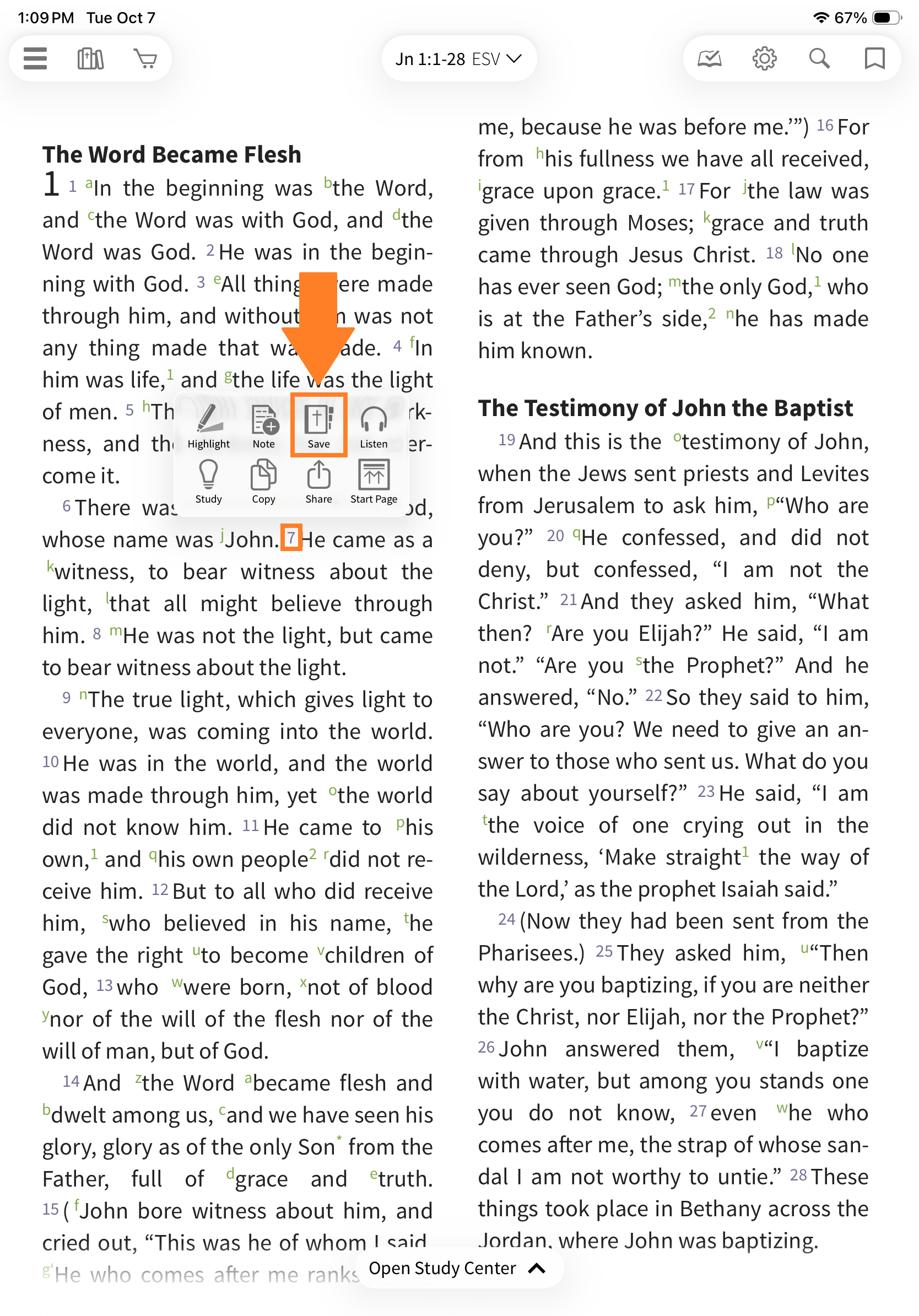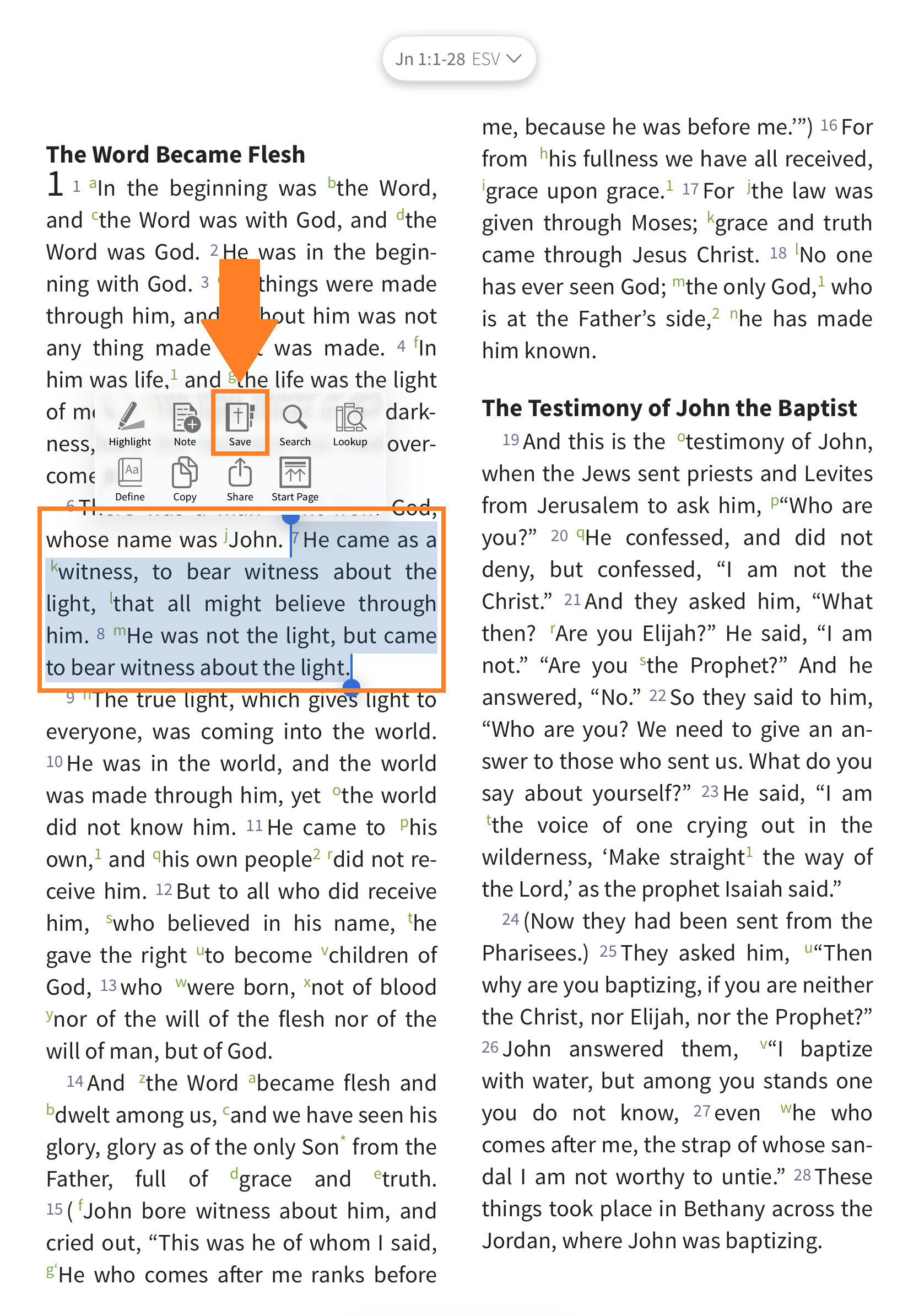 You can create a saved passage when you're viewing text in your app. As mentioned above, saved passages can be tied either to a verse or a word or phrase. Here are the steps to create a saved passage: