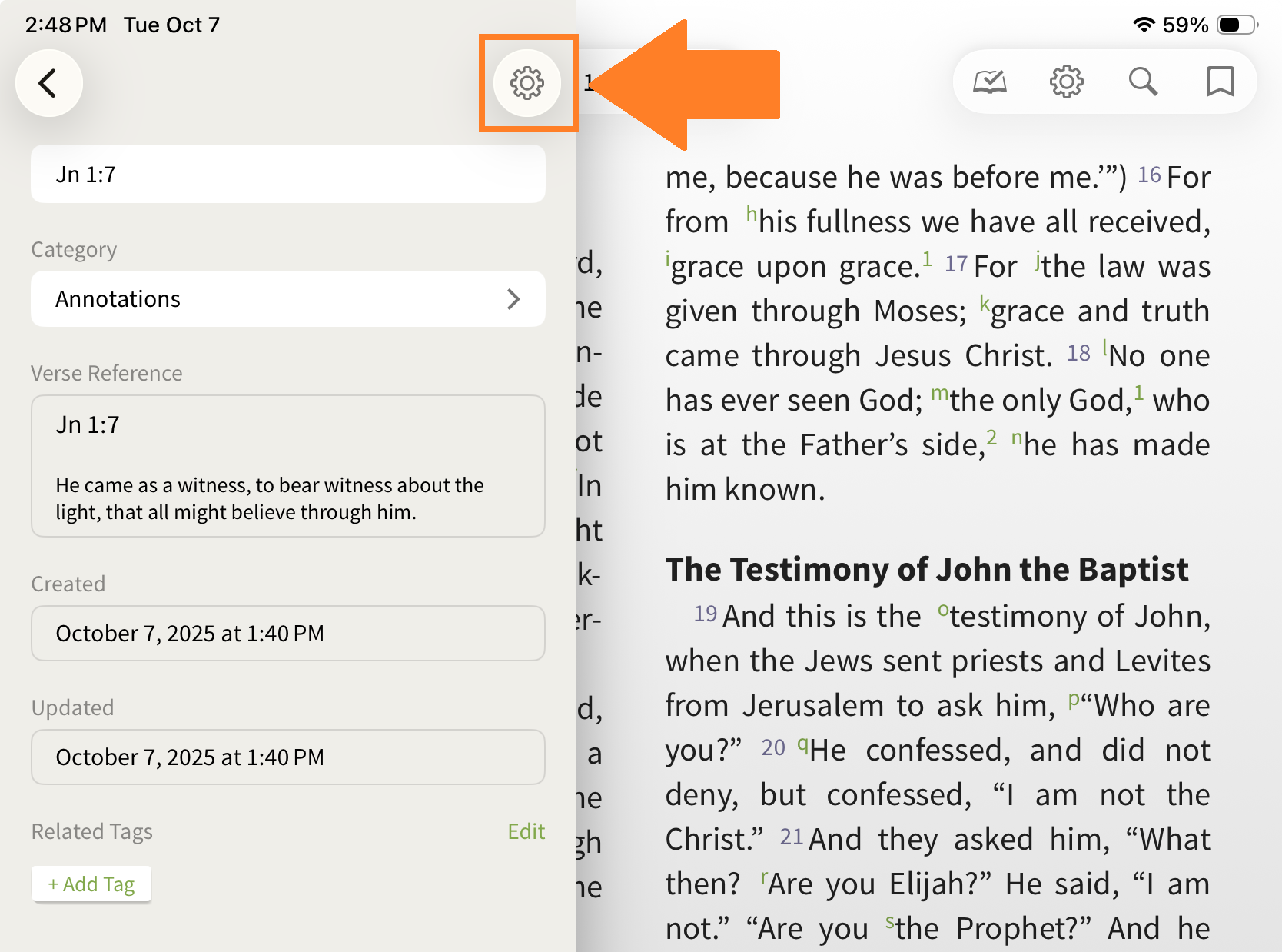 The first option is to open the Settings for the Saved Passage. Tap the Settings icon in the upper right corner.