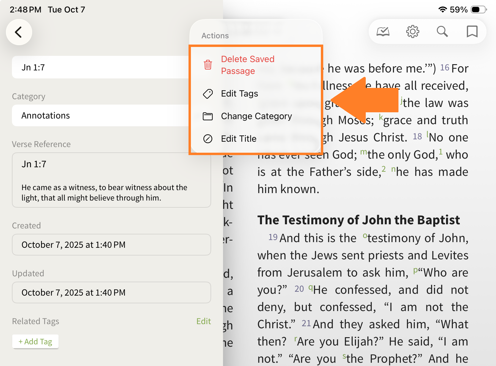 You will see a menu to access options to either 'Delete Saved Passage', 'Edit Tags', 'Change Category', or 'Edit Title.'