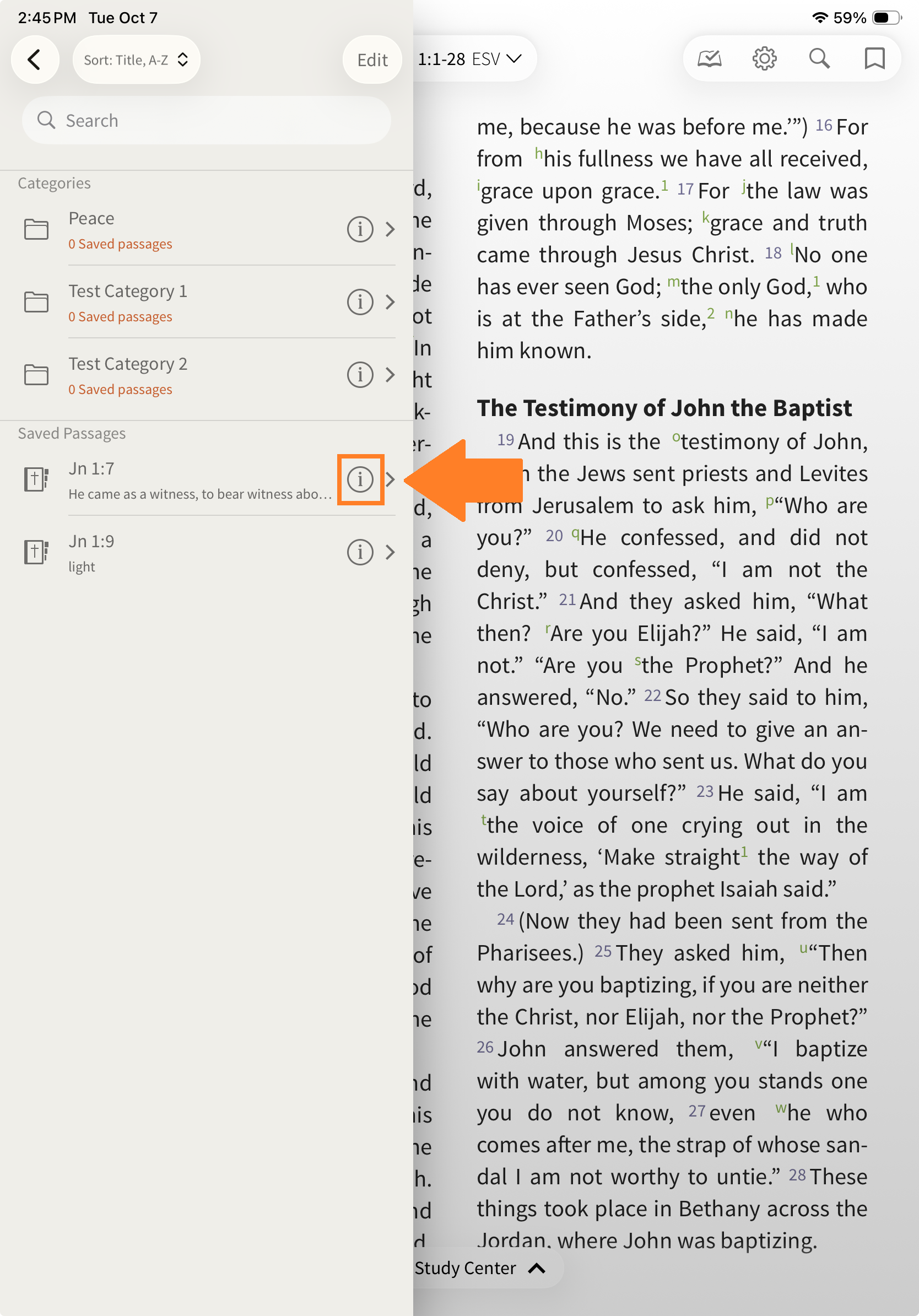 - Locate the individual saved passage you want to edit and tap the 'i' icon next to it.