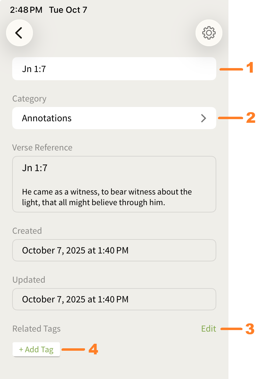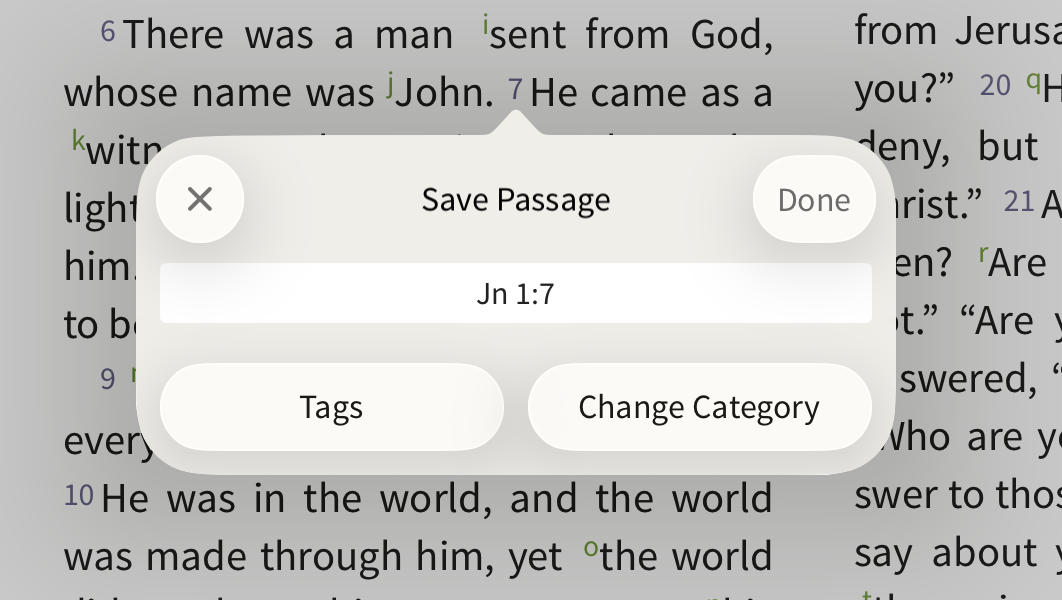 - In the Save Passage popup that appears, you can tap 'Tags' or 'Change Category' to assign any desired tags or categories to the saved passage. You can also tap in the text field to give the saved passage a different title than the text that is pre-populated. When you're finished, tap 'Done' to create the saved passage.