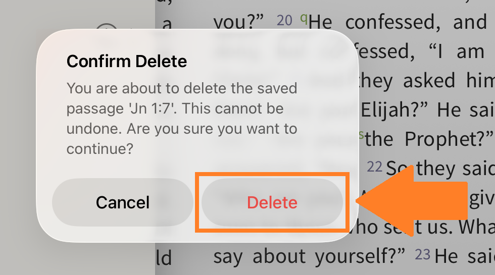 - Swipe from right to left on the Saved Passage and select the 'Delete' button.