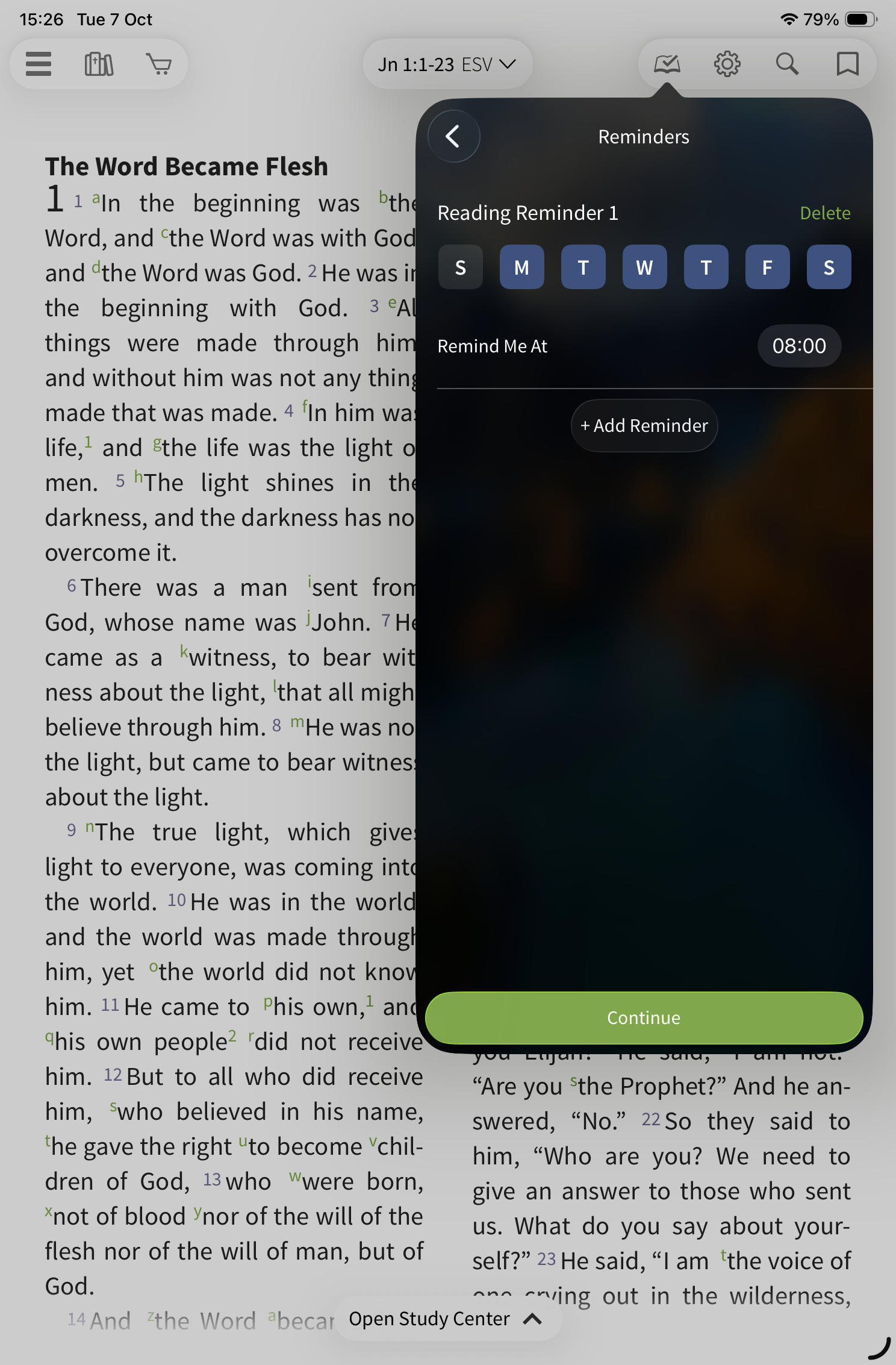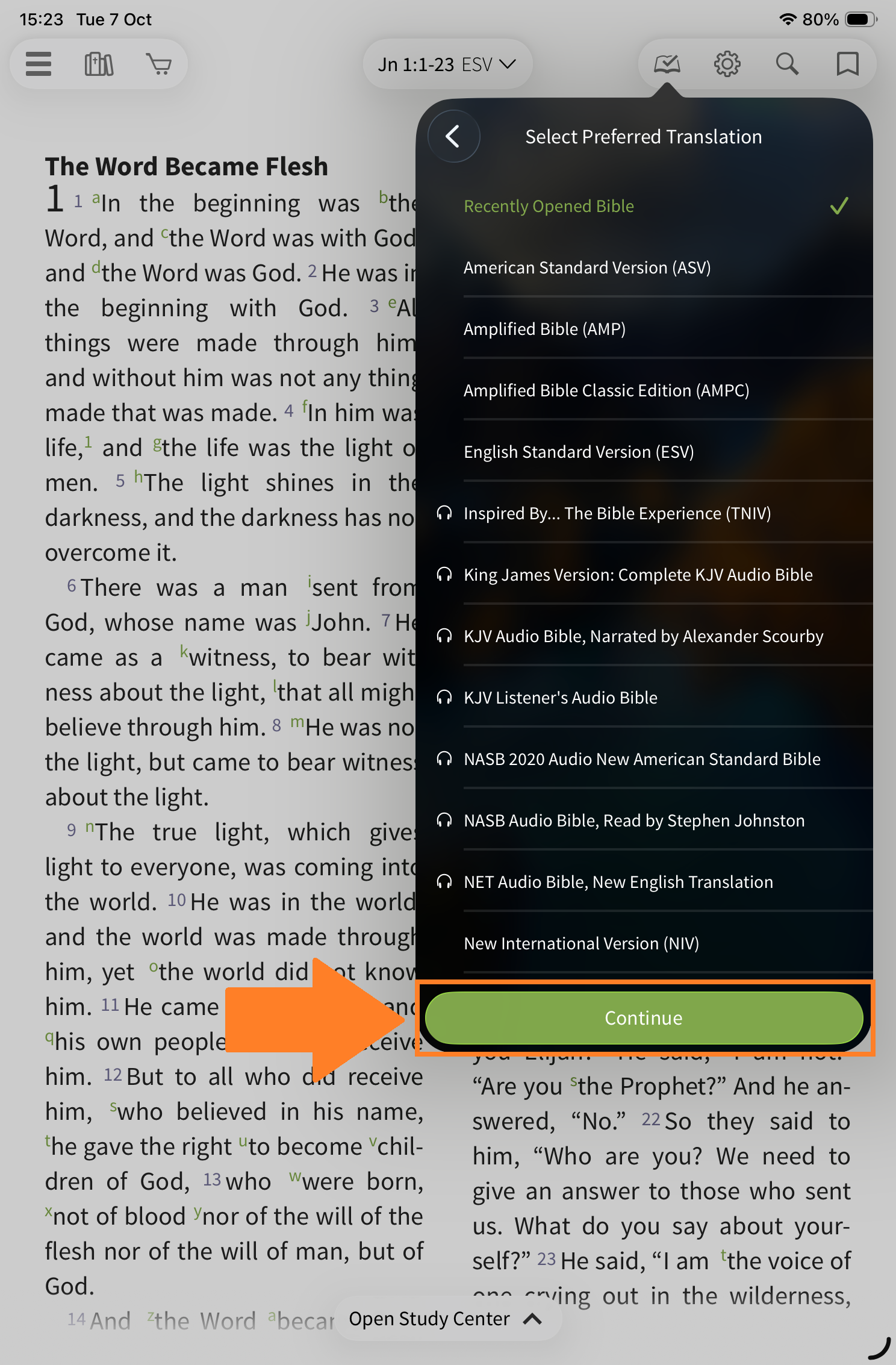 downloaded Bible text or audio Bible. Once selected, tap Continue.