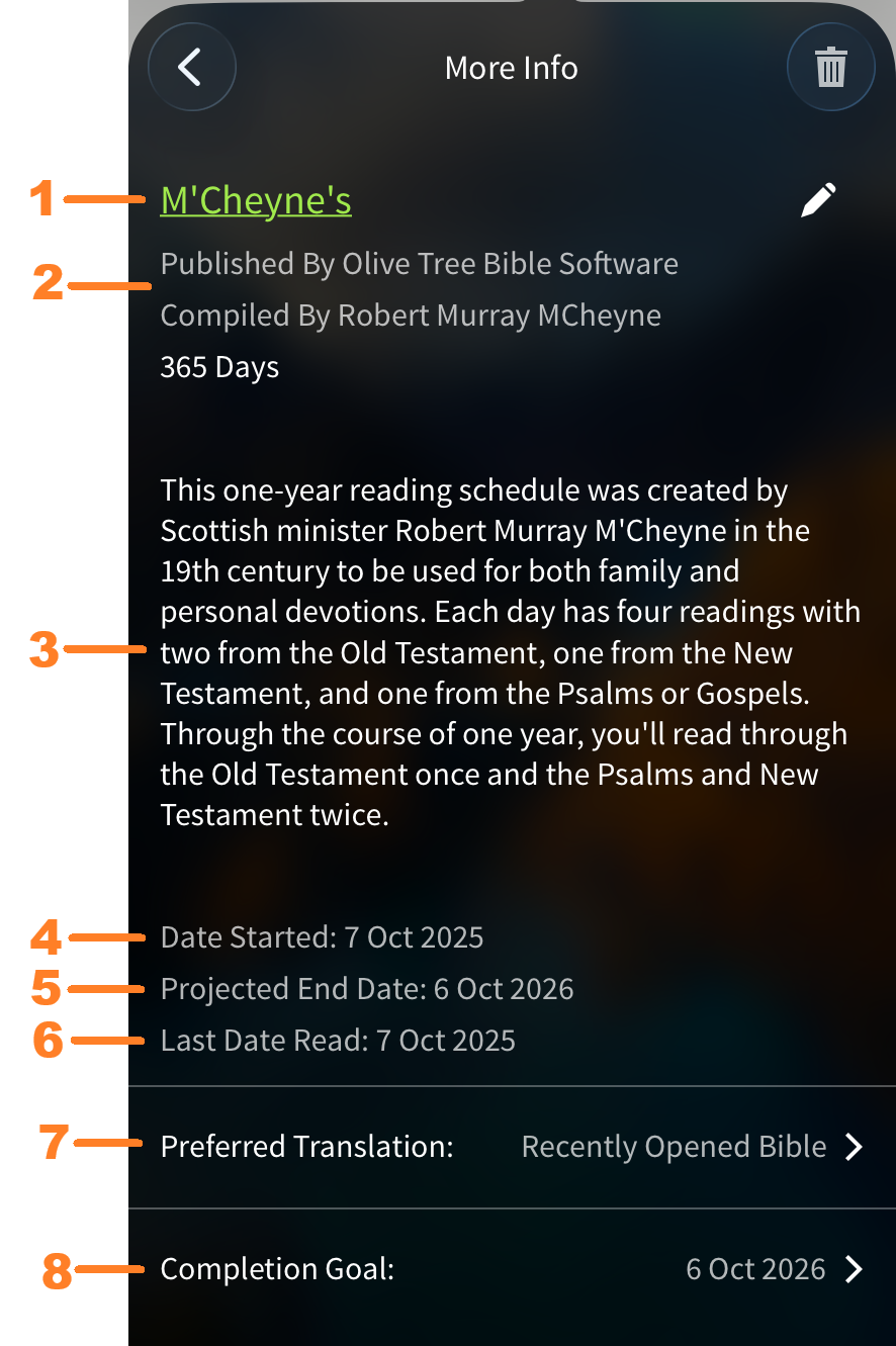 This will let you set a Completion Goal and the date will be shown here once a goal is set. Once set the app will show how many readings need to be completed each day to complete your plan by your goal. Please note the date set as your goal will also be listed as your Projected End Date.