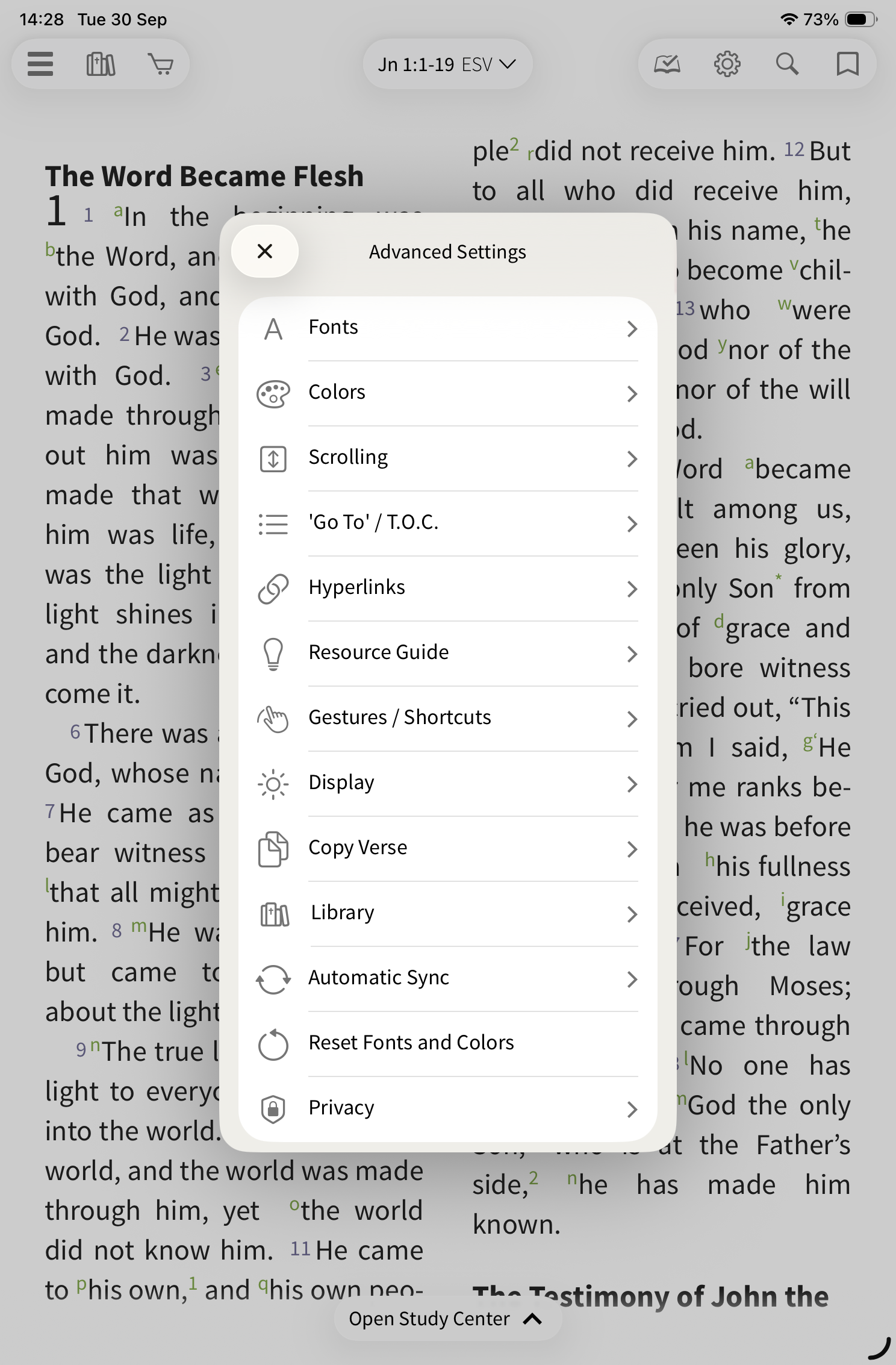 The app’s settings allow you to customize features such as font size, colors, scrolling style, hyperlink behavior, and more. This article provides an overview of the available settings, with brief explanations where helpful.