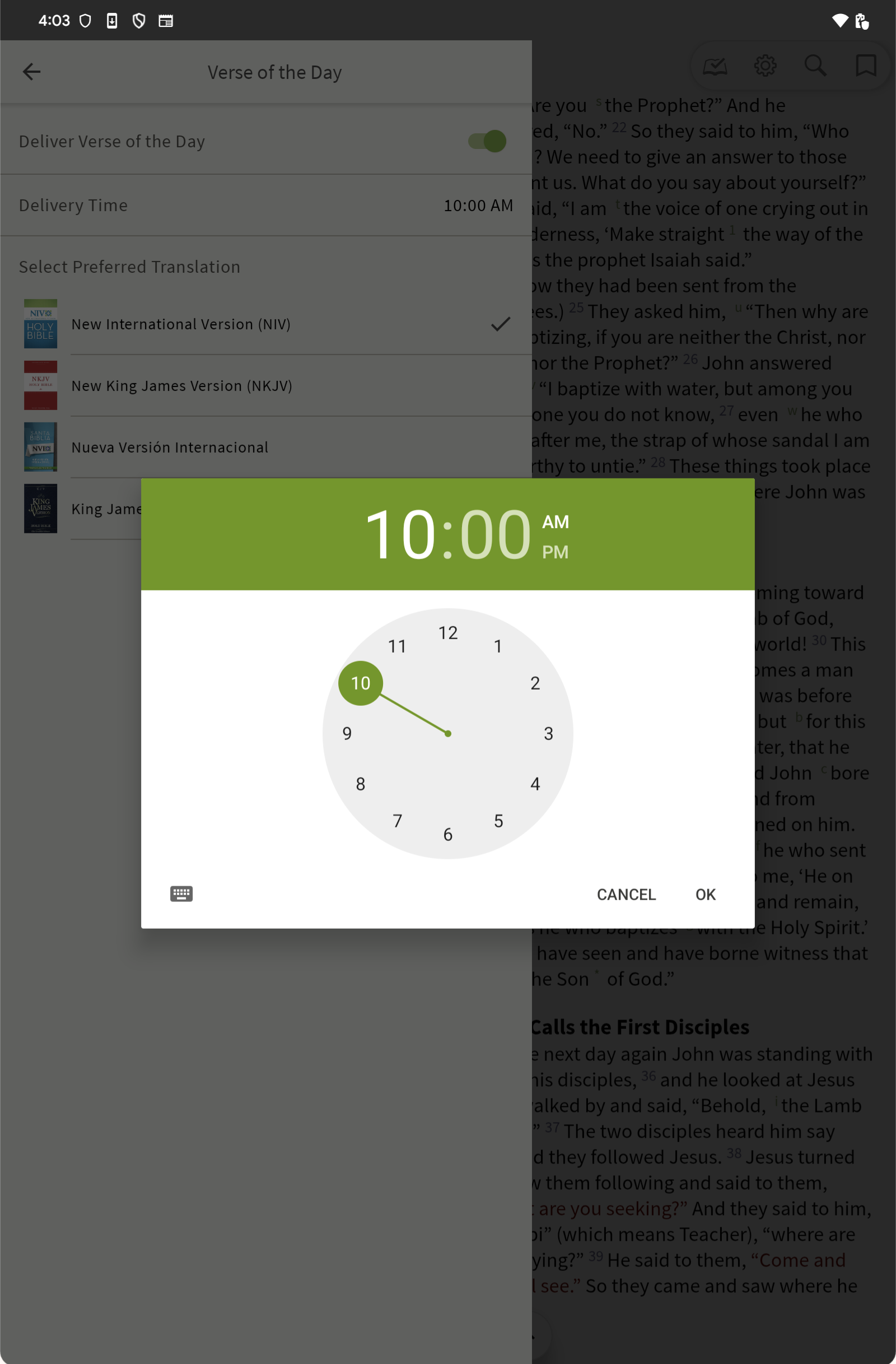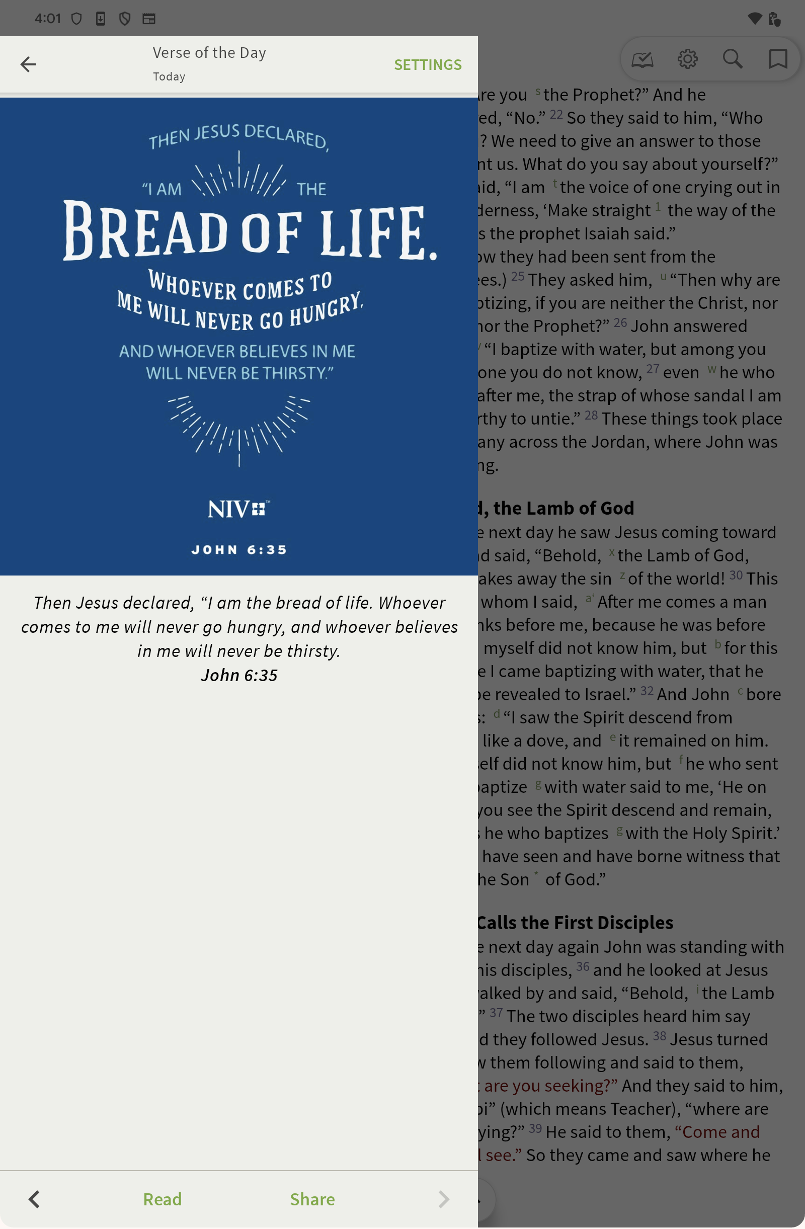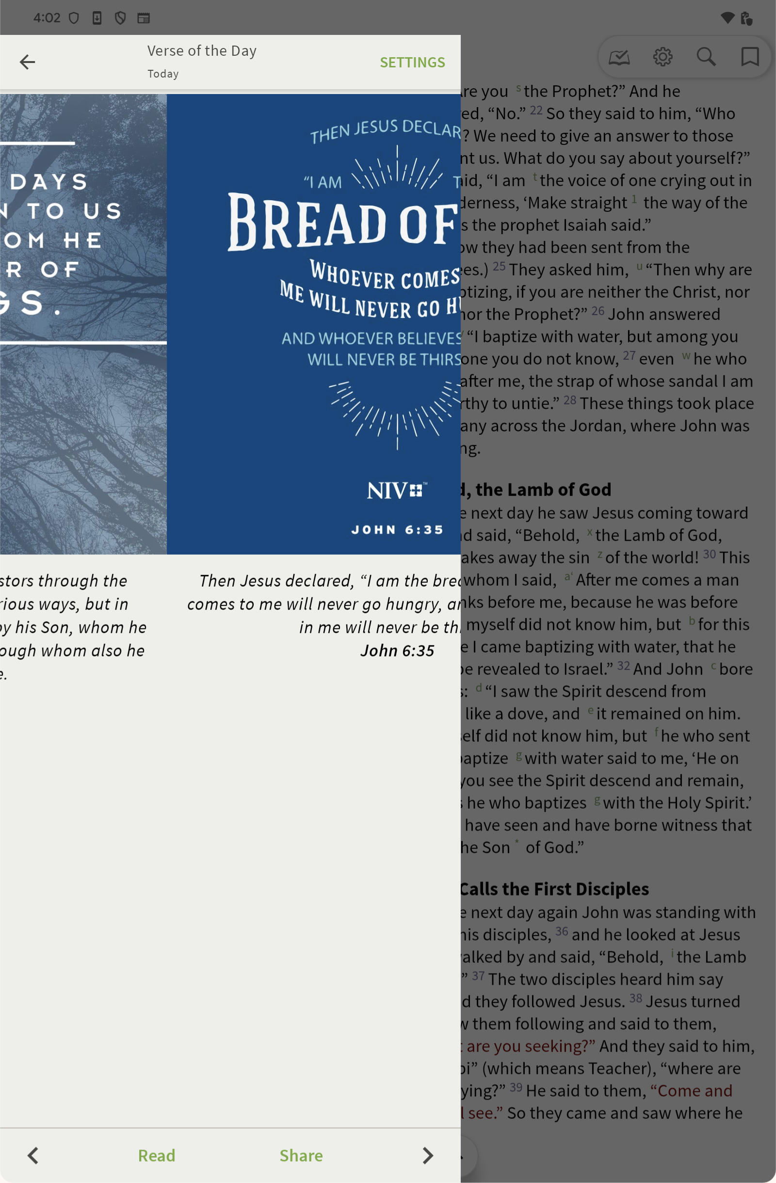 By tapping 'Settings' in the upper right corner, you can choose to receive Verse of the Day notifications, when you would like to receive them, and which of four translations you would like to receive the Verse of the Day in.