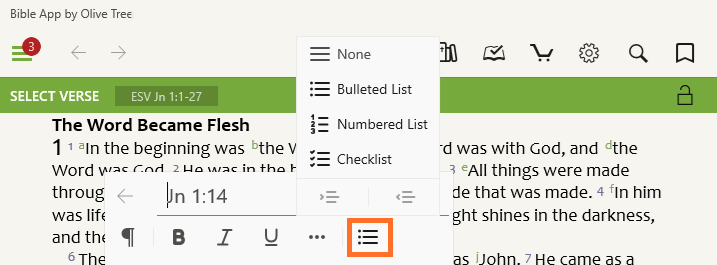 - Checklist formatting allows you to track the important things - progress through a study, prayer requests, setting quick to-dos, or anything else you need to follow up on.