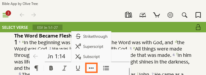 - Superscript and subscript capabilities bring the power of footnotes to your personal thoughts and studies, supporting expanded explanations or literary citations.