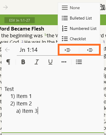 While viewing the list options, you will also see options to shift items in the list to the left or right. Below we have indented the third bullet to the right.