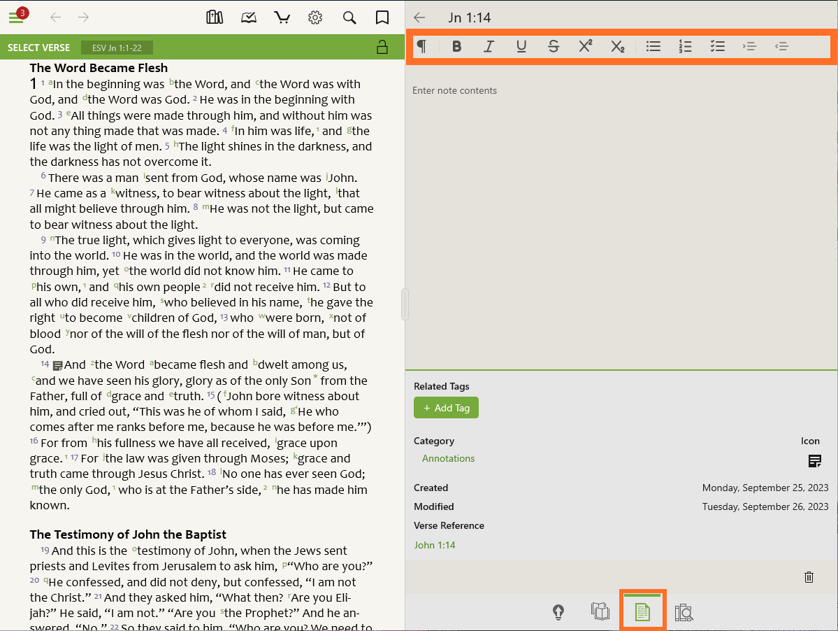 We are excited to offer Enhanced Notes in the Olive Tree Bible App! The Enhanced Notes feature offers even more customization to your Olive Tree Bible experience. These transformational features bring new options to your notetaking, allowing you to more fully express your thoughts and ideas.