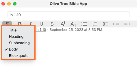 The pilcrow icon will allow you to format text as either a Title, Heading, Subheading, Body, or Blockquote.