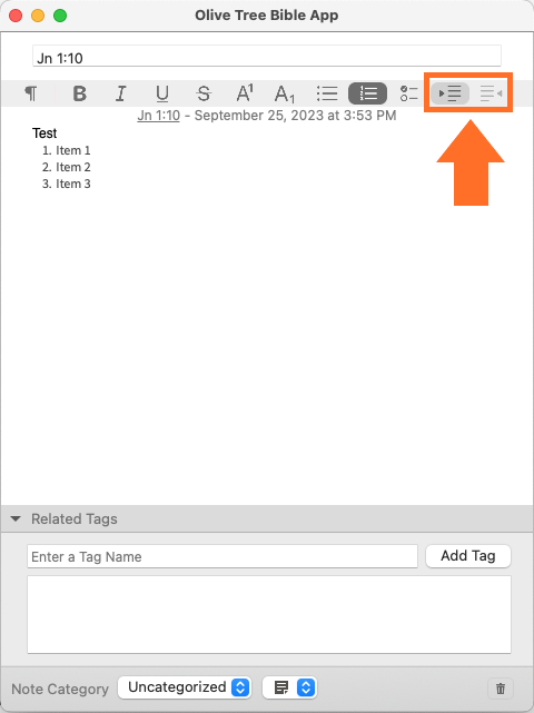 While editing a list, tap these icons to shift the text to the left or right.