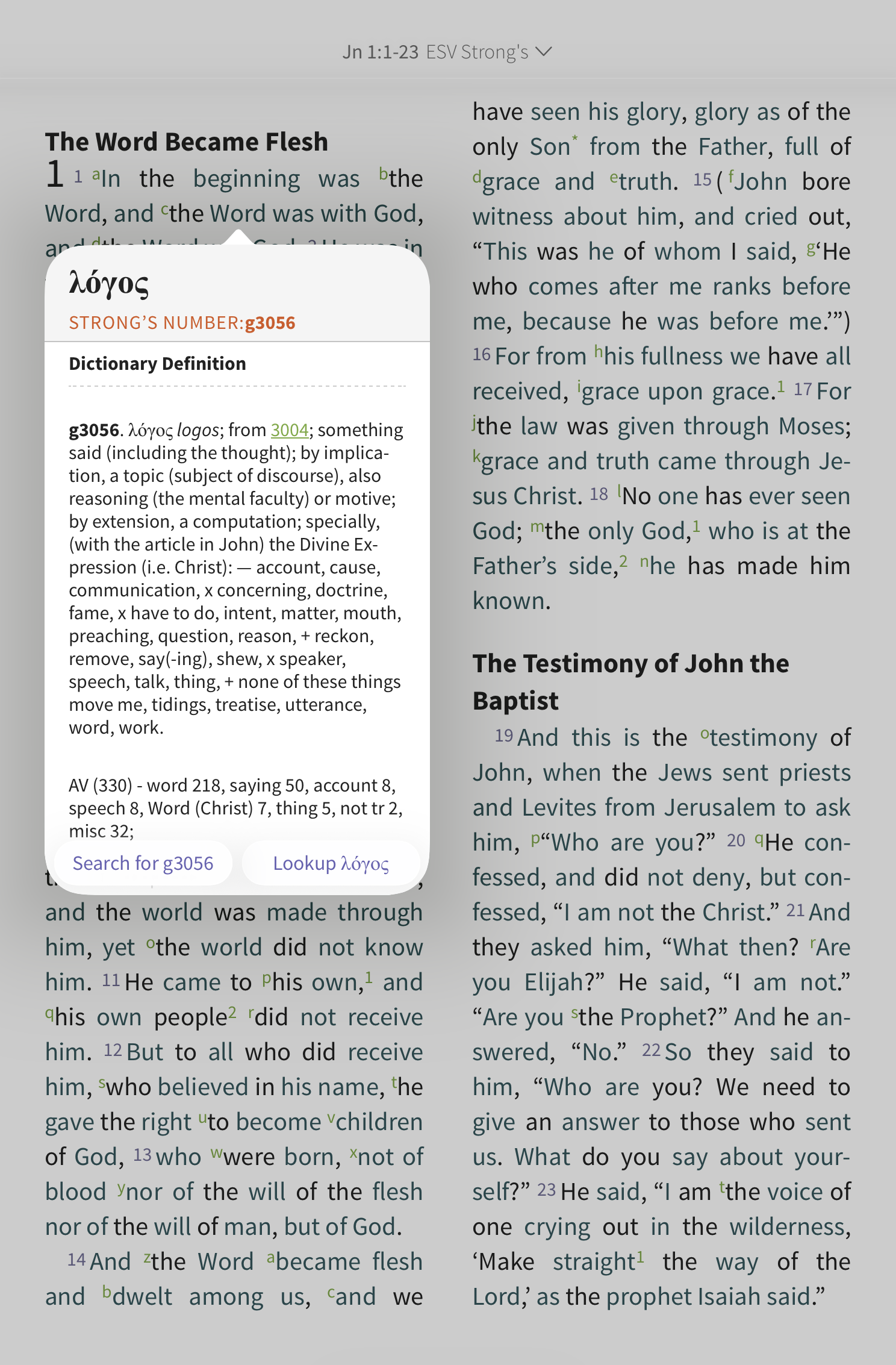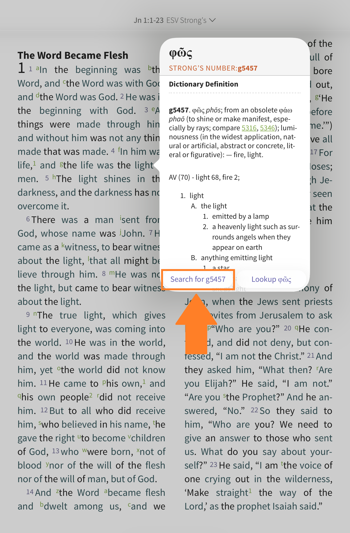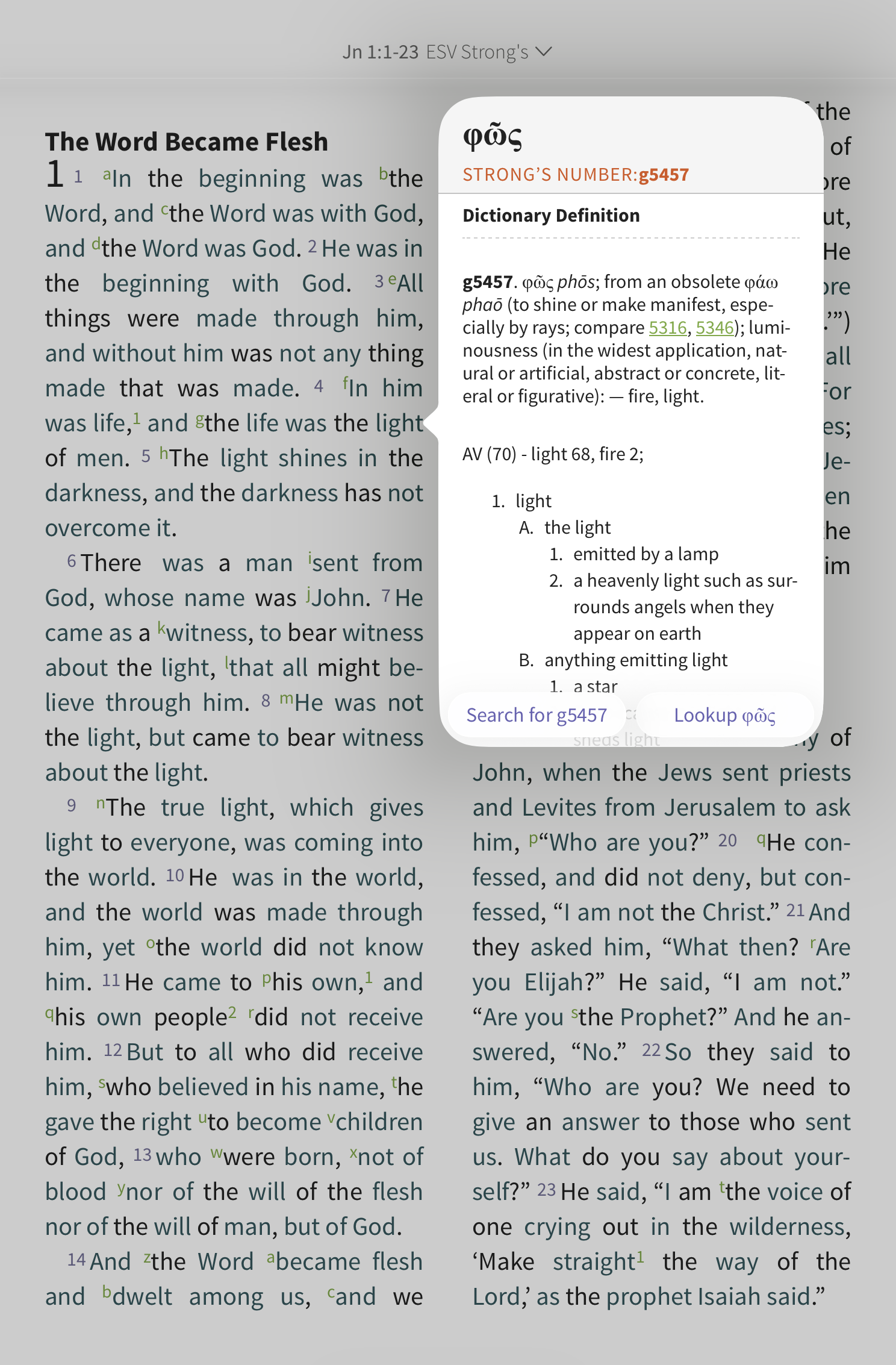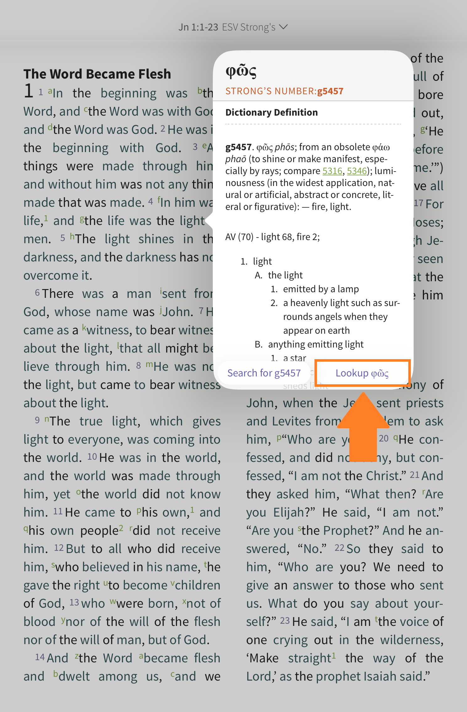 This allows you to search your current book for the Strong's number or the word in the original language. - "Search for..." offers the same function as the search in #6, but is part of the UI (user interface). "Look Up..." allows you to look up the original word in any Greek or Hebrew dictionaries that you have downloaded in the app.