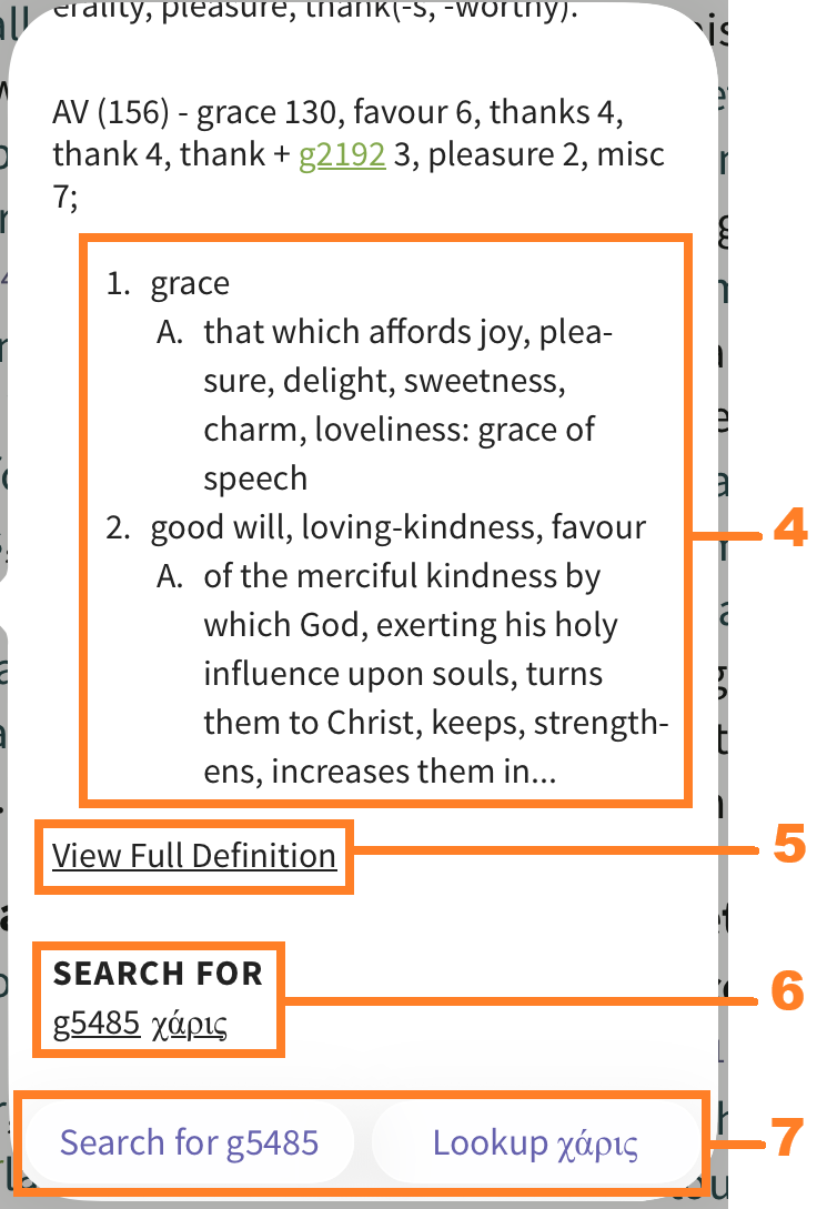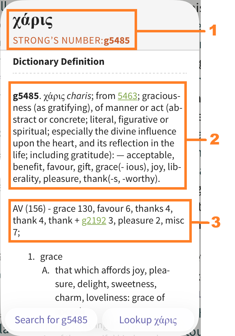 - This shows the original Greek or Hebrew word, as well as the Strong's number for the word/number you tapped on.
