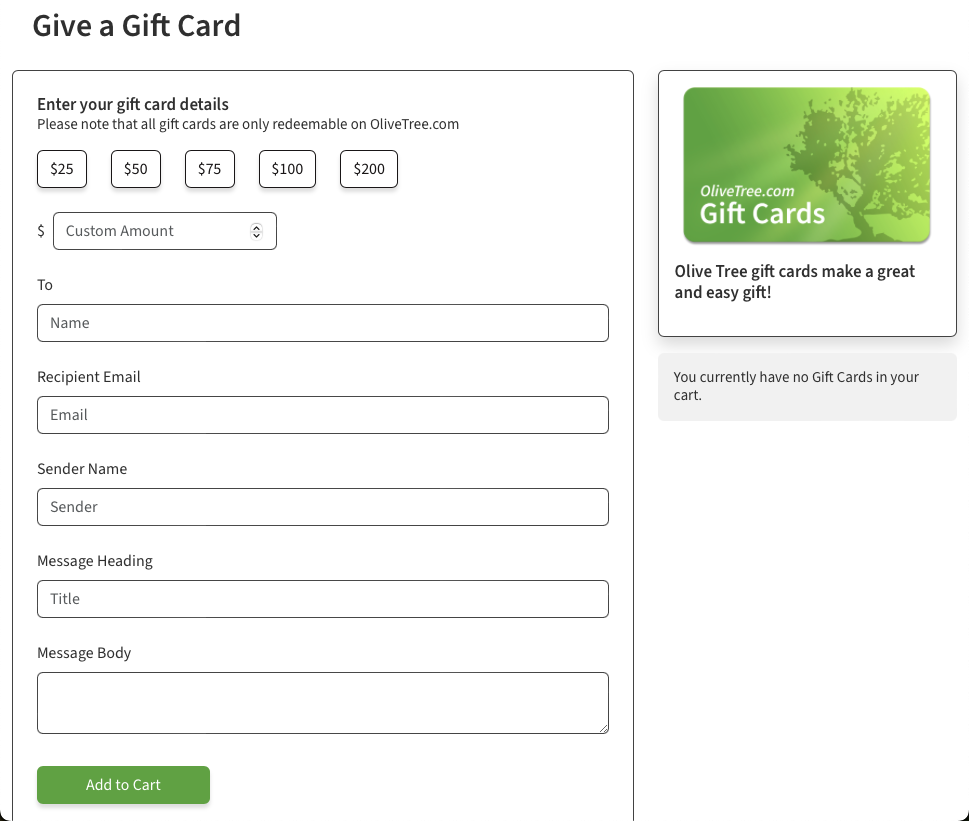 There are a few ways that you can give or send an Olive Tree gift card to a recipient.