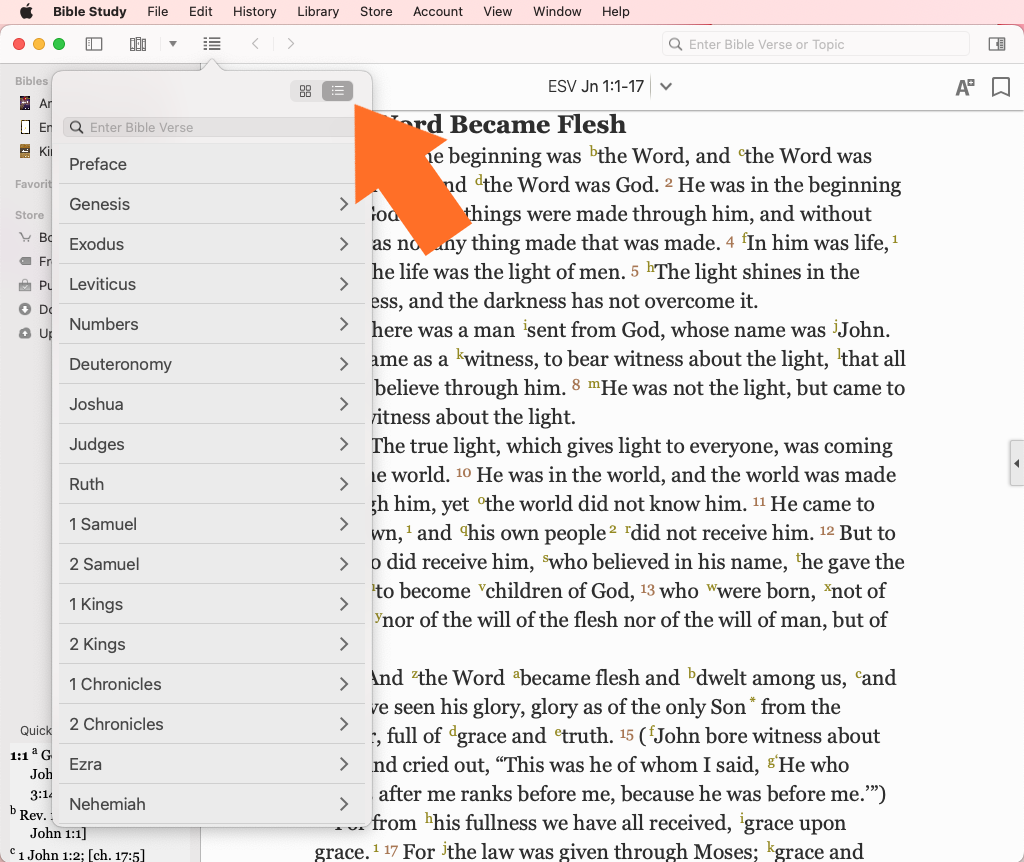 The List View will automatically appear for resources that are not verse based, like dictionaries, encyclopedias, handbooks, etc. List View can also be used for verse-based resources like Bibles or commentaries if you prefer a list with the full names of Bible books.