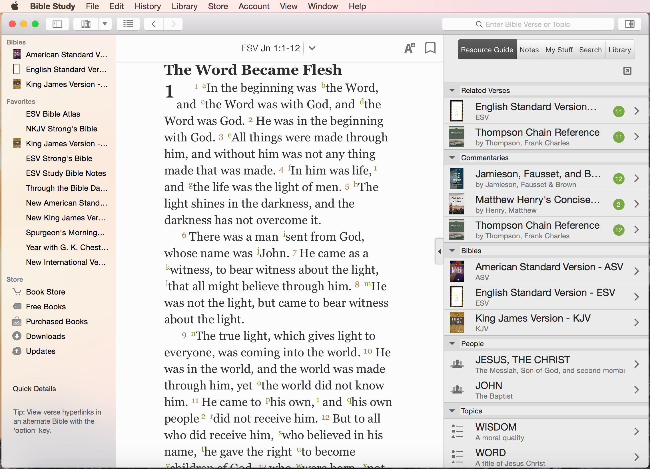 When you have a Bible in the main window, select the Study Center icon in the upper right corner of the app to open the Study Center: