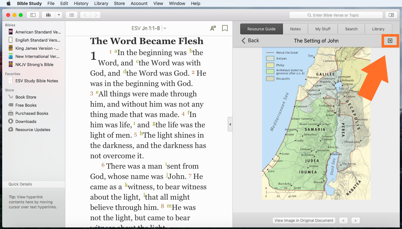 Select the map to view it in the Study Center. To zoom in on the map, you can select the diagonal arrow in the upper right corner of the Resource Guide to open the map in a pop-out window and make it larger.