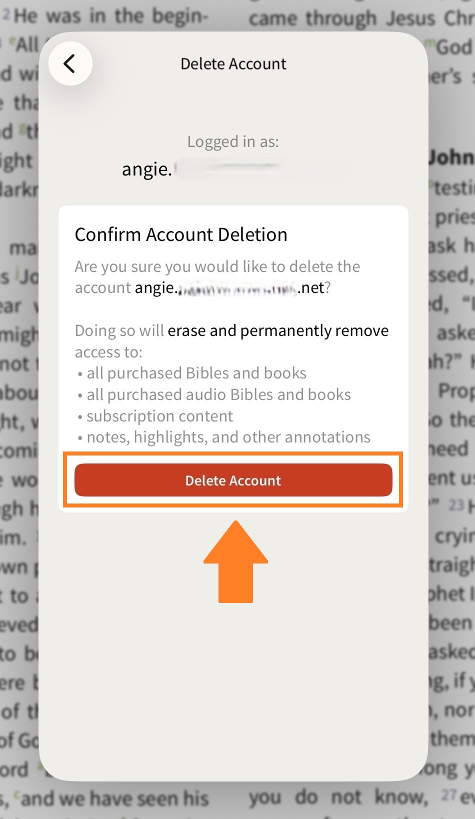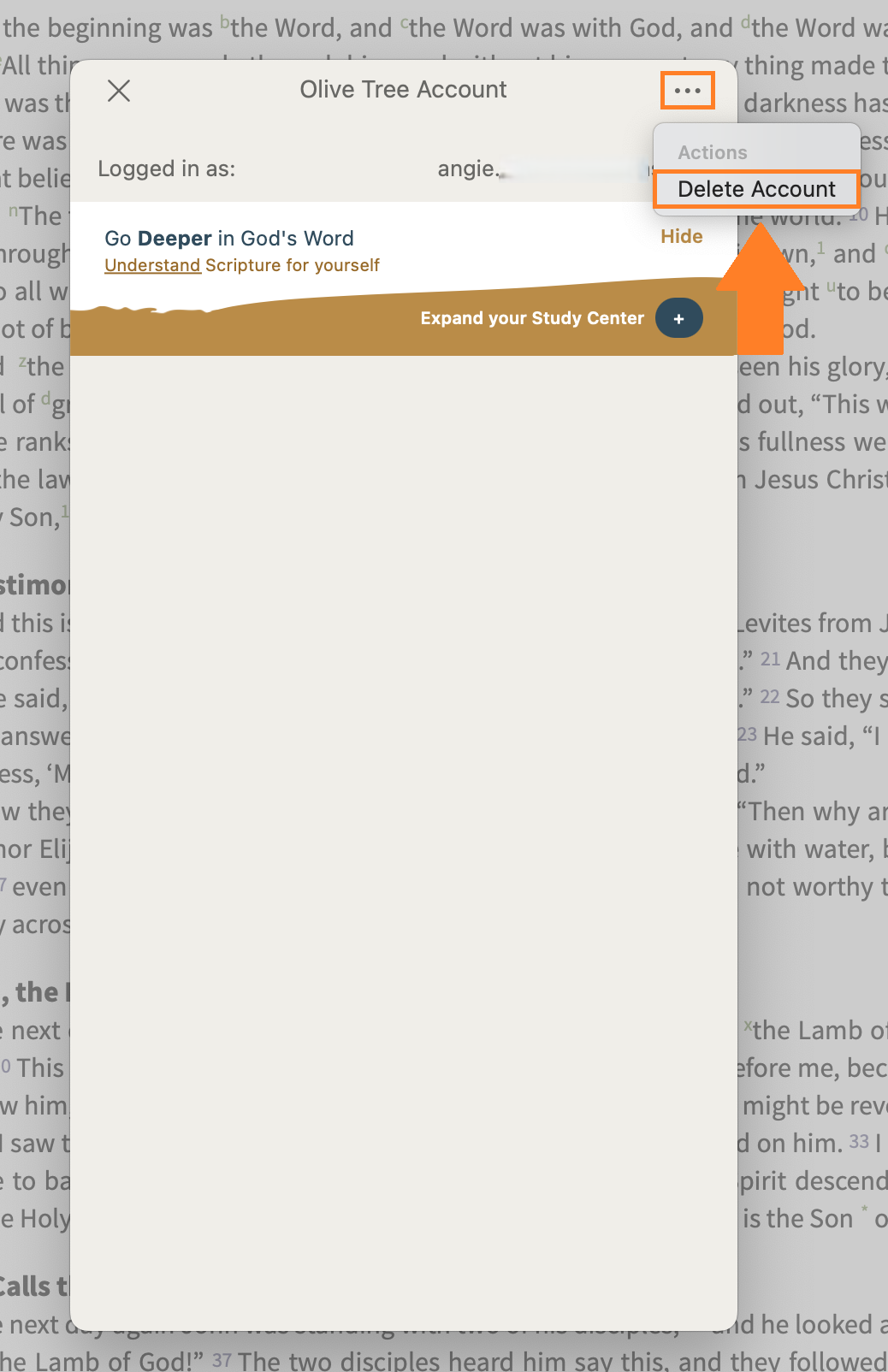 Tap 'Delete' to generate a ticket with the Olive Tree Customer Support team. A Customer Support representative will email you shortly to confirm and complete the account deletion. Please reply to the email from Customer Support to complete the deletion process.