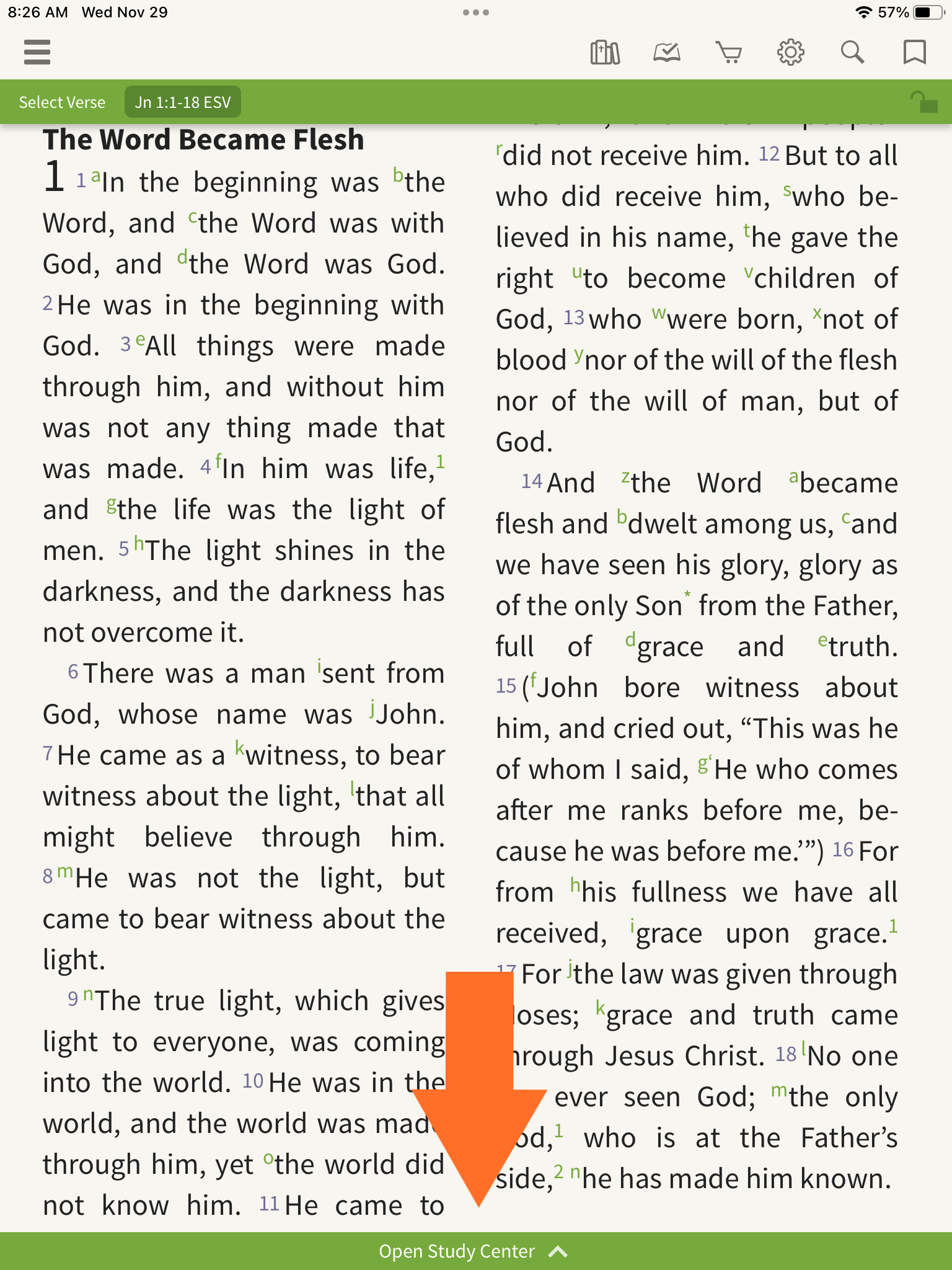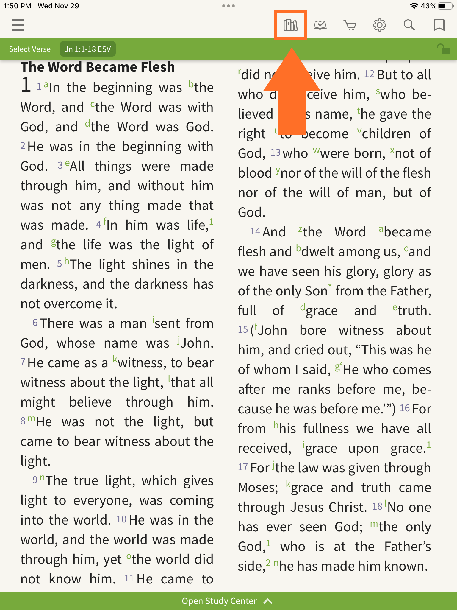 With a Bible open in the main window, tap 'Open Study Center'.