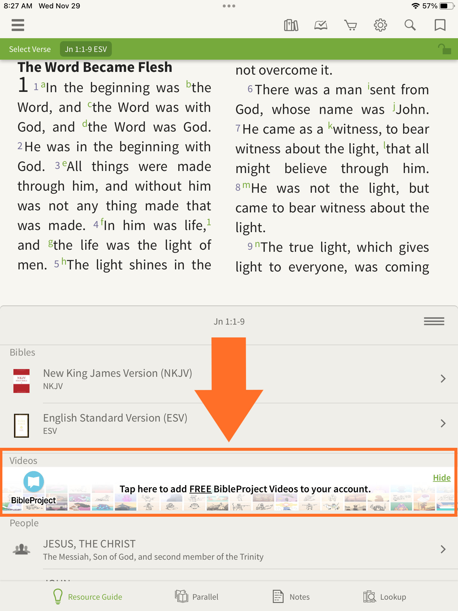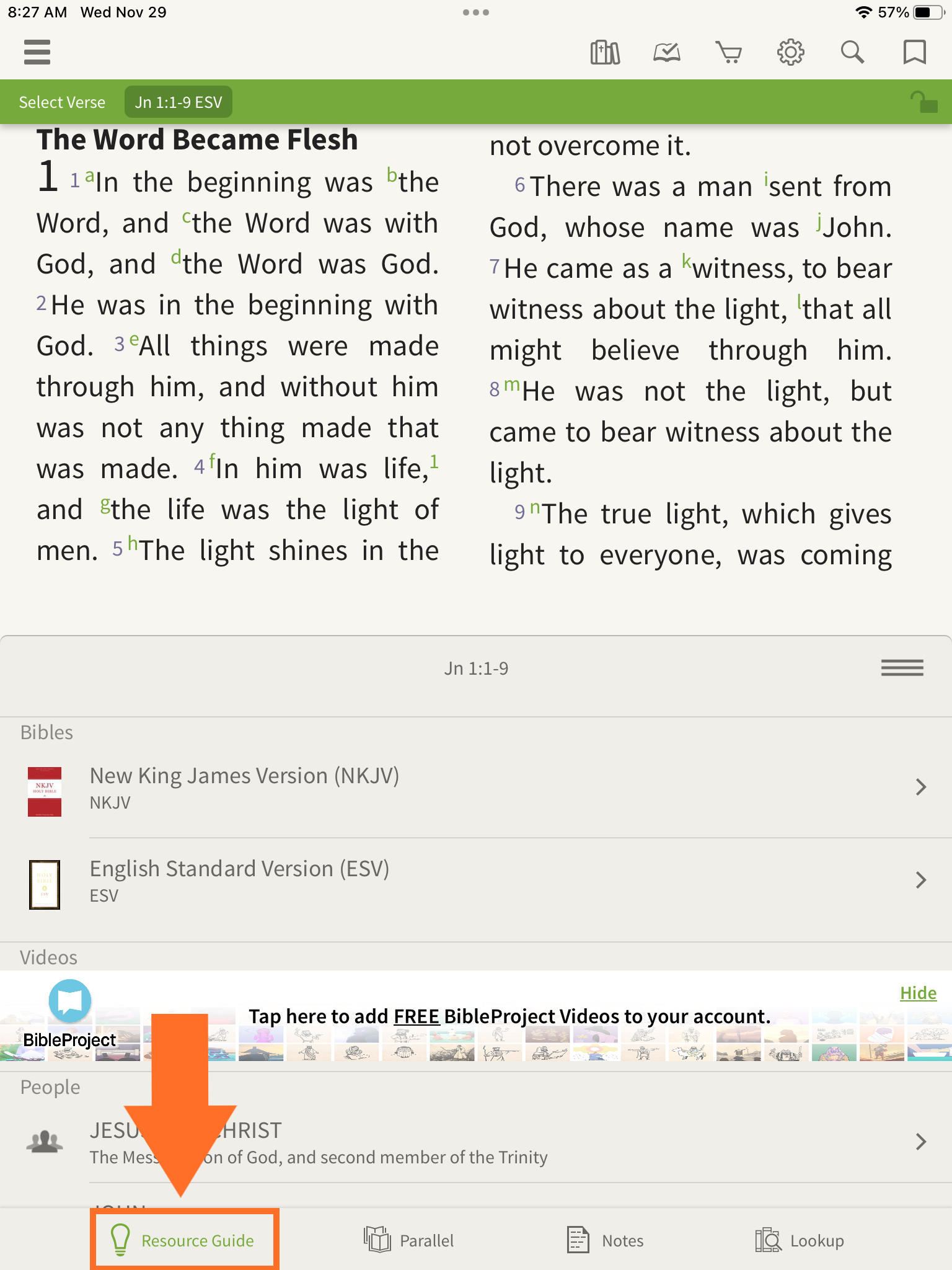 The Resource Guide displays study materials—such as commentaries, maps, and videos—related to the passage you’re reading.