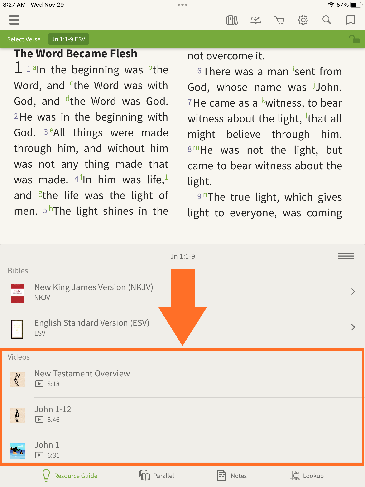 Videos related to the Bible verses you are viewing will be displayed in the Videos section. Select a video to play it.