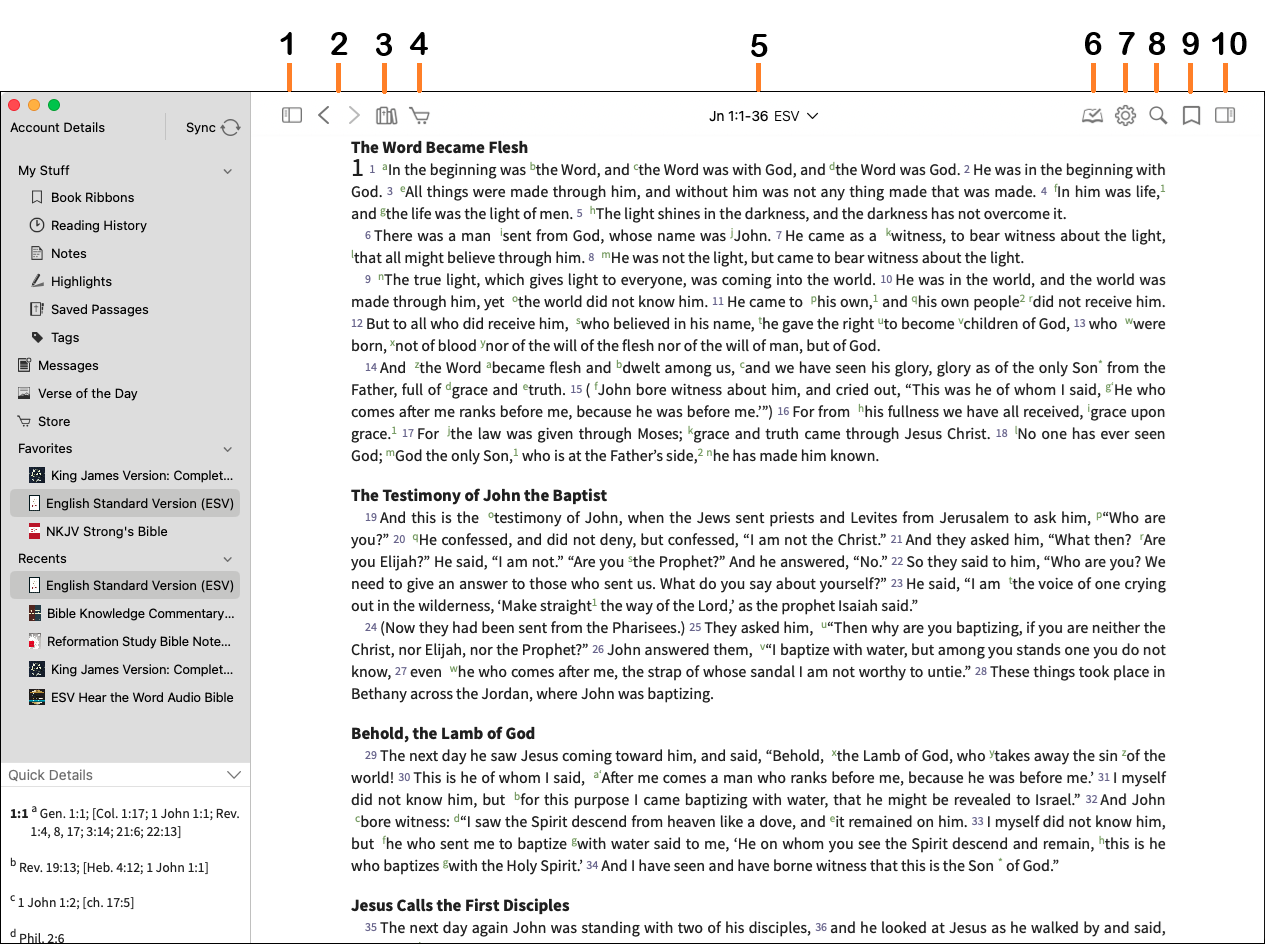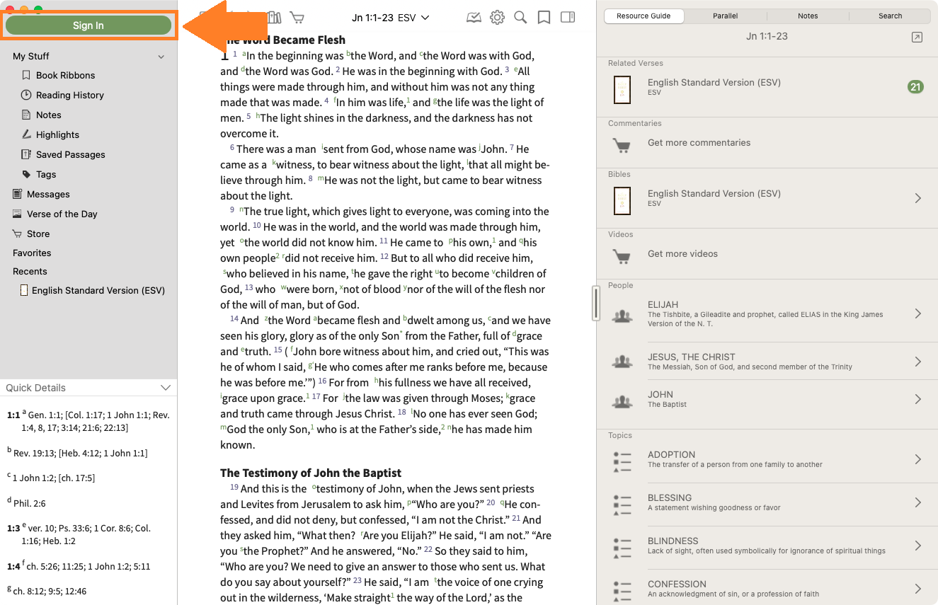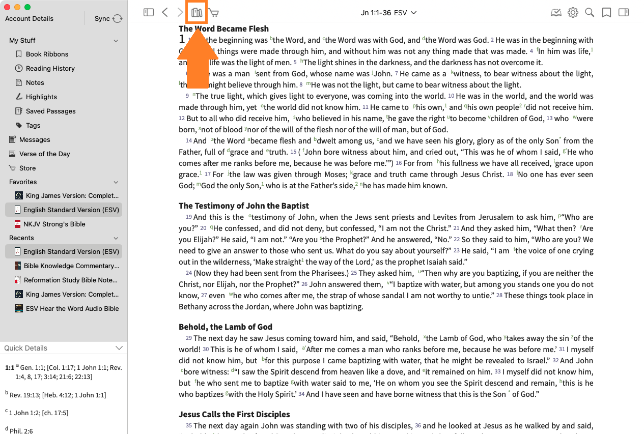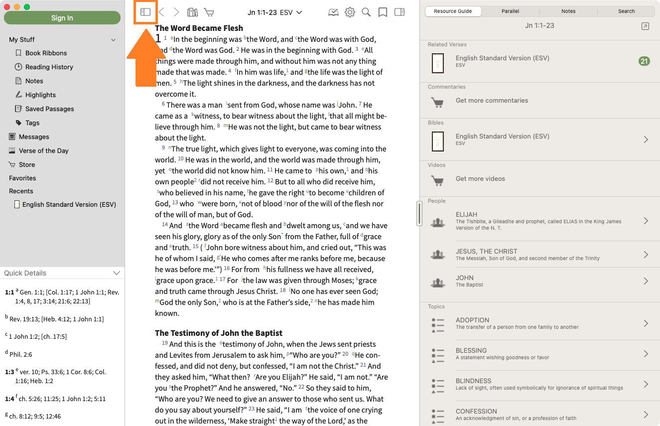 - Sidebar - Open and collapse the sidebar. The sidebar allows quick access to Bibles, Favorites, Notes, Highlights, Reading History, Messages, and more.