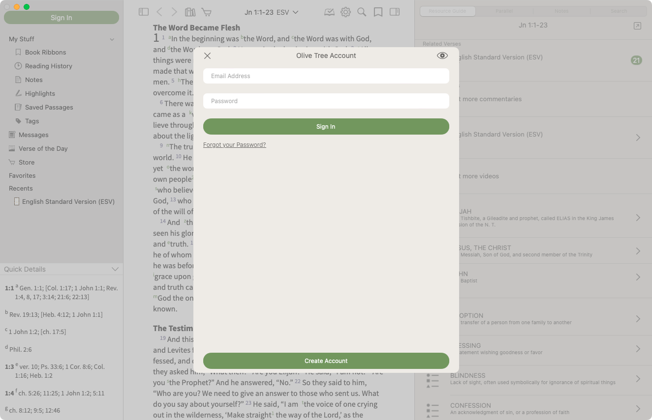 - Enter your login information and select 'Sign In'. If you don't yet have an Olive Tree account, select 'Create Account'.