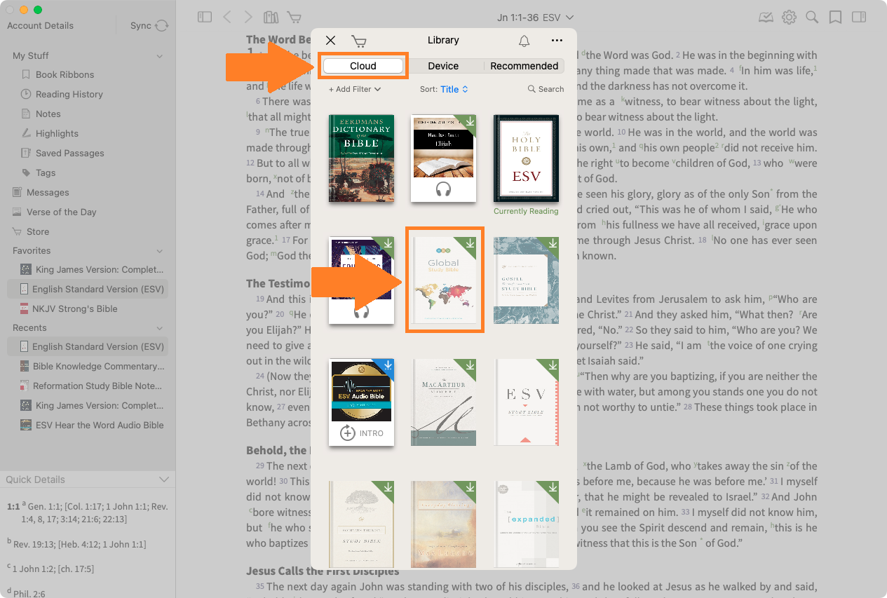 Ensure you are on the 'Cloud' tab of the Library. Bibles and books that are not yet downloaded are dimmed with a download arrow. Select one of these cover images to initiate the download.