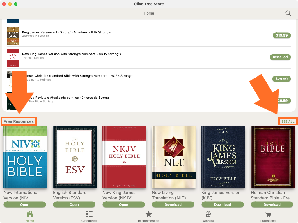The Olive Tree Bible App is free to download in the Mac App Store. Once you install the app, you will have access to free features, like reading plans, personal notes and highlights, parallel reading and free resources. We offer over 100 free resources, including many top Bible translations, so you can start your Bible study right away. This article will show you how to download and open free resources in your Olive Tree Bible App.