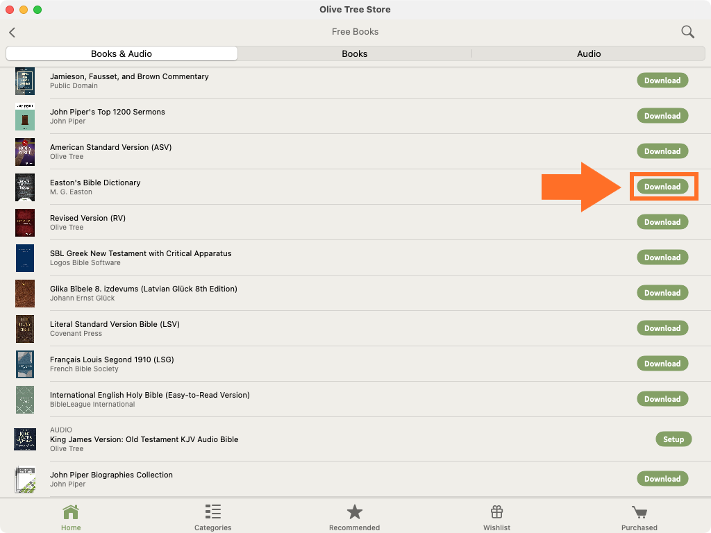 Scroll through the list to see the variety of free Bibles, books, etc. you can download to your Library in the app. Each resource in the list has a Download button on it. If it is a free audio resource, the button may say 'Setup' instead. When you see a resource you want to add to your Library, select Download: