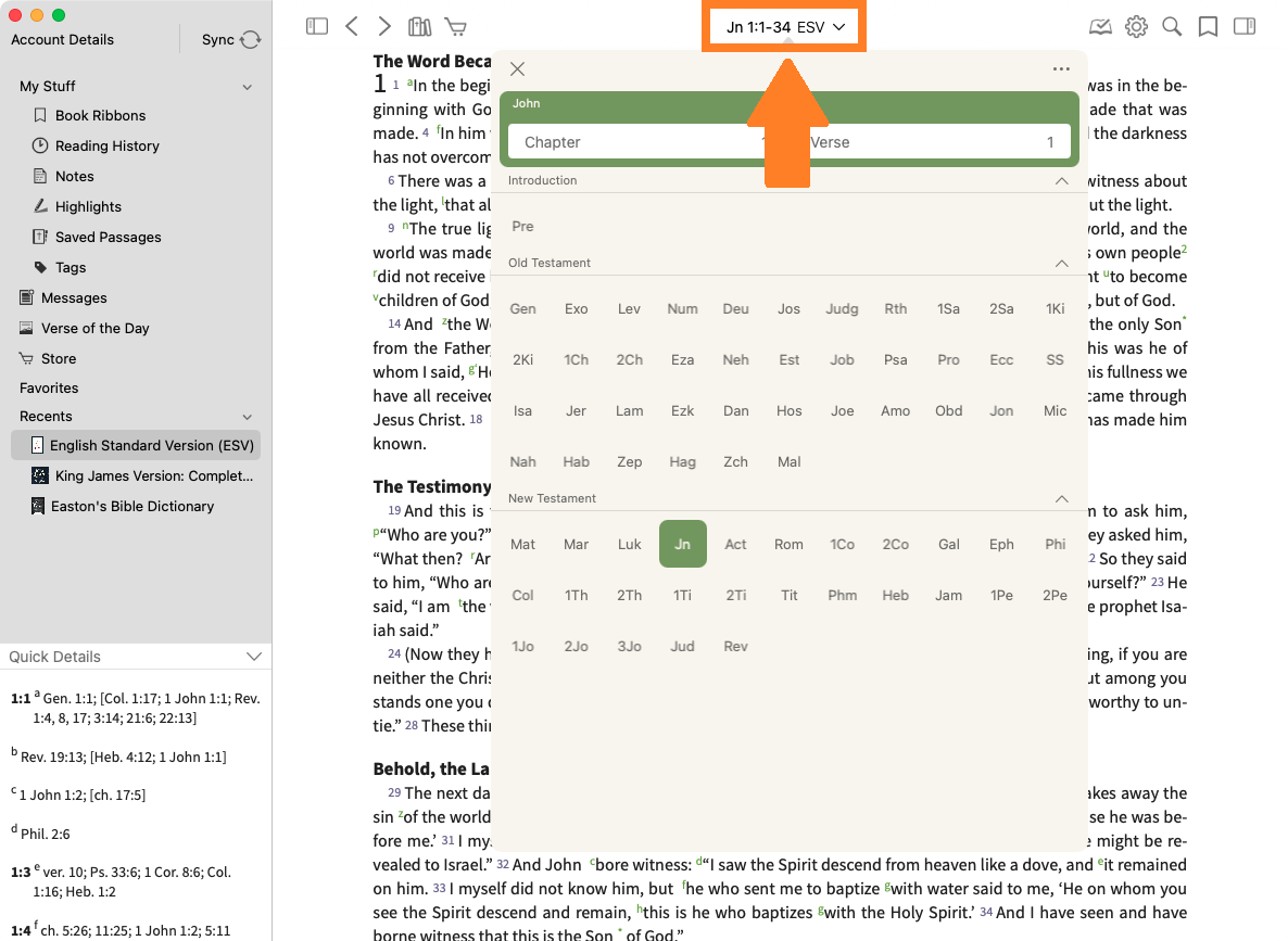 You can open the navigation menu by selecting the location reference at the top of the window. This is true for both the main window and the Parallel window in the Study Center.