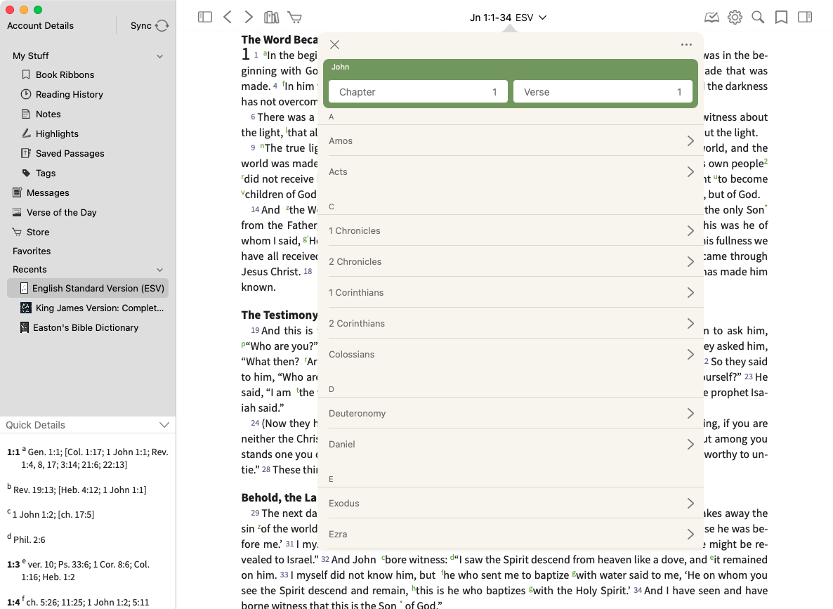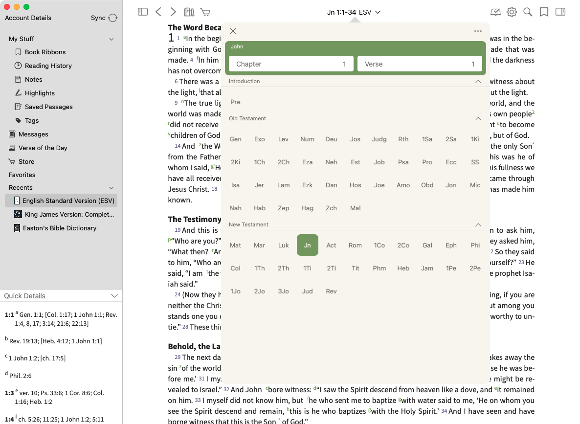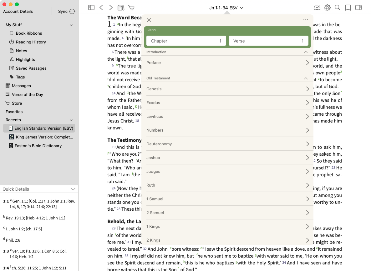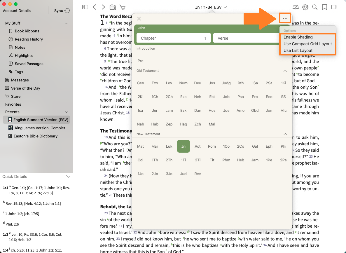 The Grid View is the default view for verse-based resources, like Bibles and commentaries. This view makes it easy to select a book, chapter, and verse.
