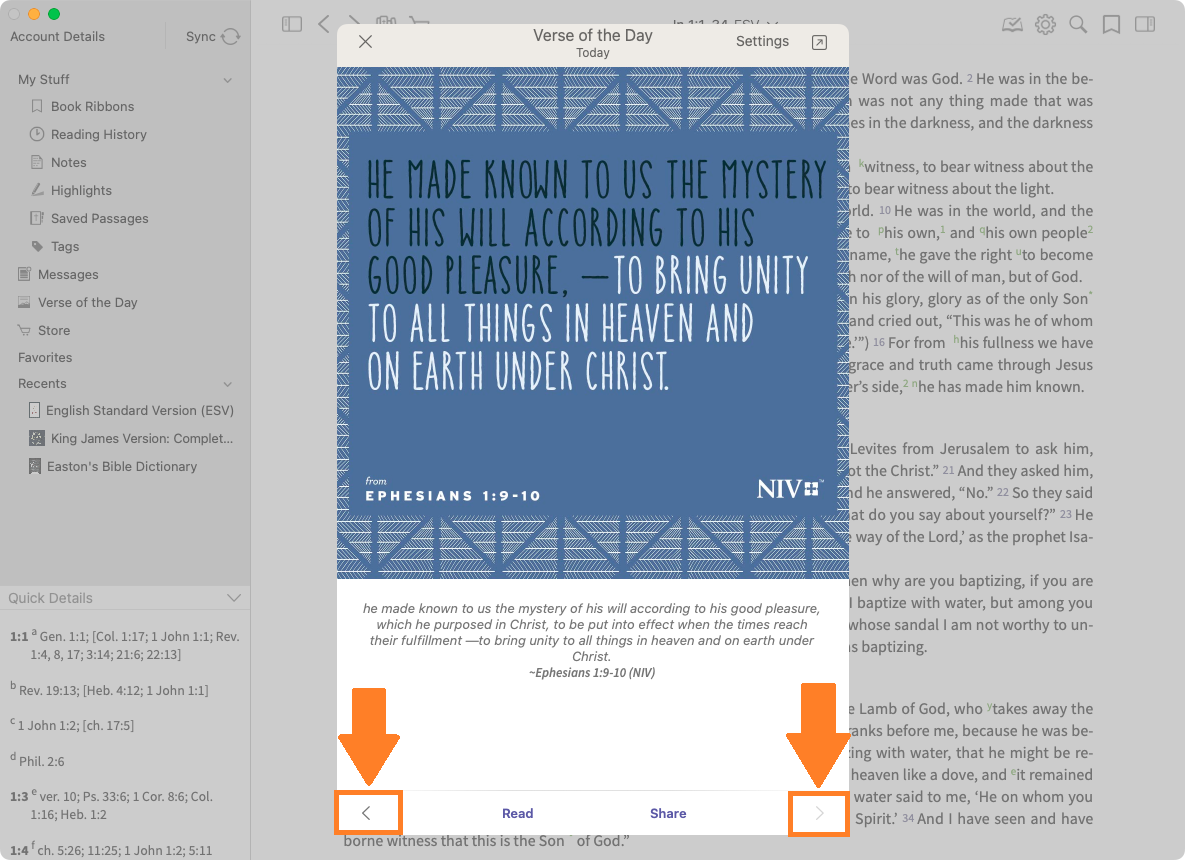 The arrows at the bottom allow you to see verses from previous days that you may have missed.
