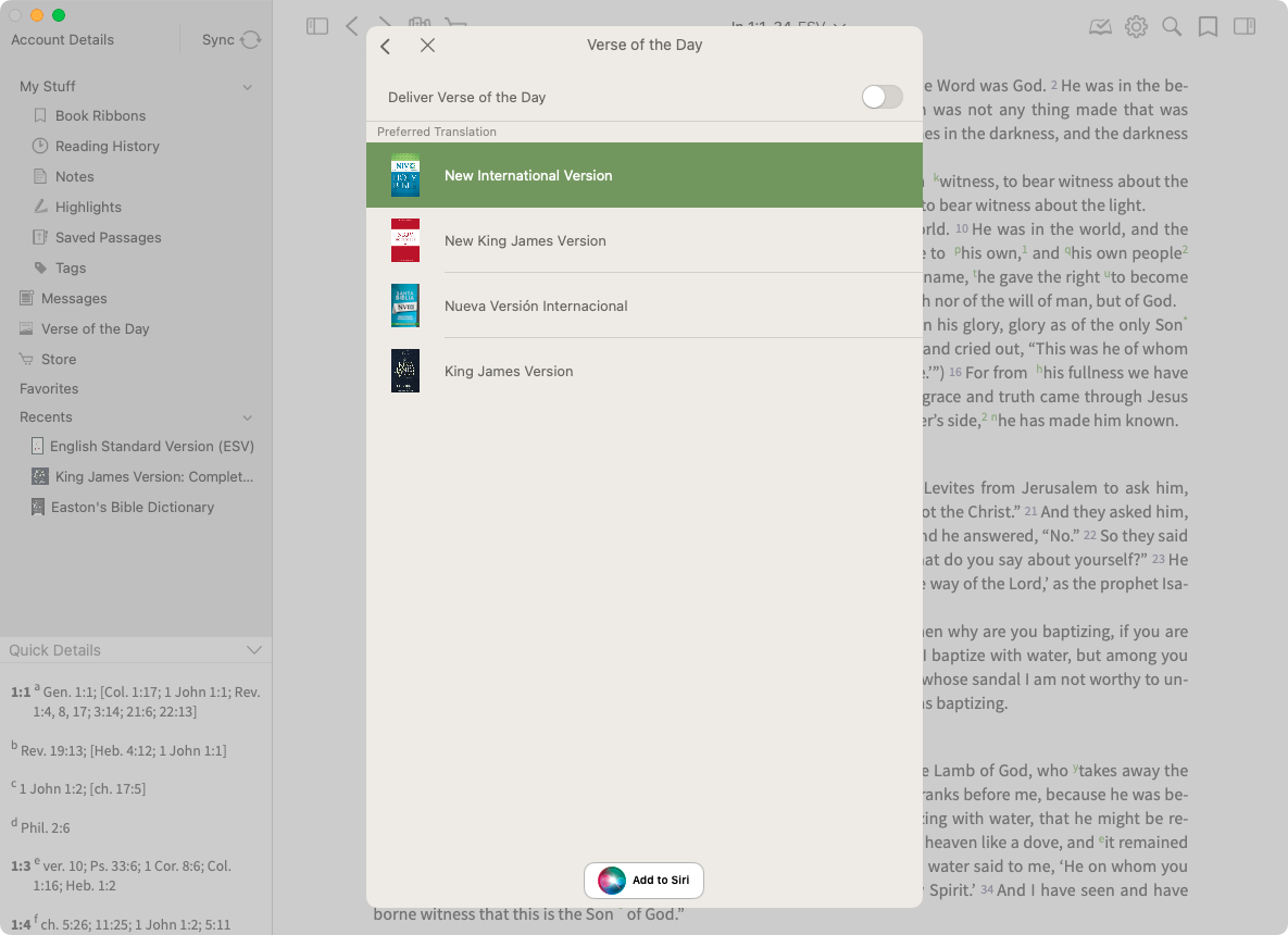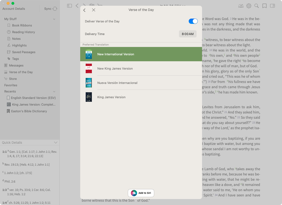 By selecting 'Settings' in the upper right corner, you can choose to receive Verse of the Day notifications, when you would like to receive them, and which of four translations you would like to receive the Verse of the Day in.