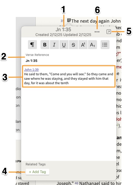 - Verse-Based Notes: Created by selecting a verse number. These notes are tied to that verse and appear across all downloaded Bible translations.