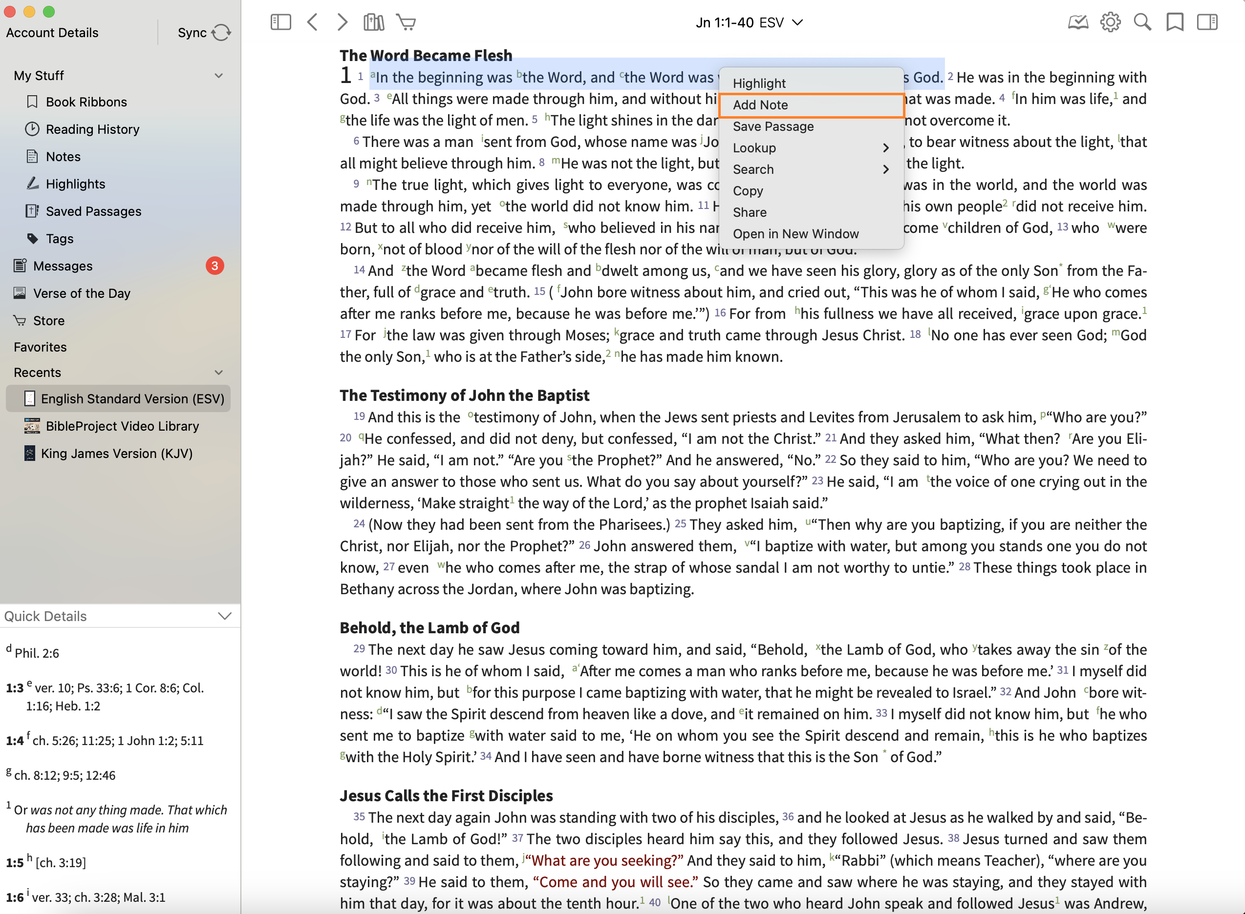 - Select a verse number or select text and then secondary click on the selected text (or hold 'control' and click).