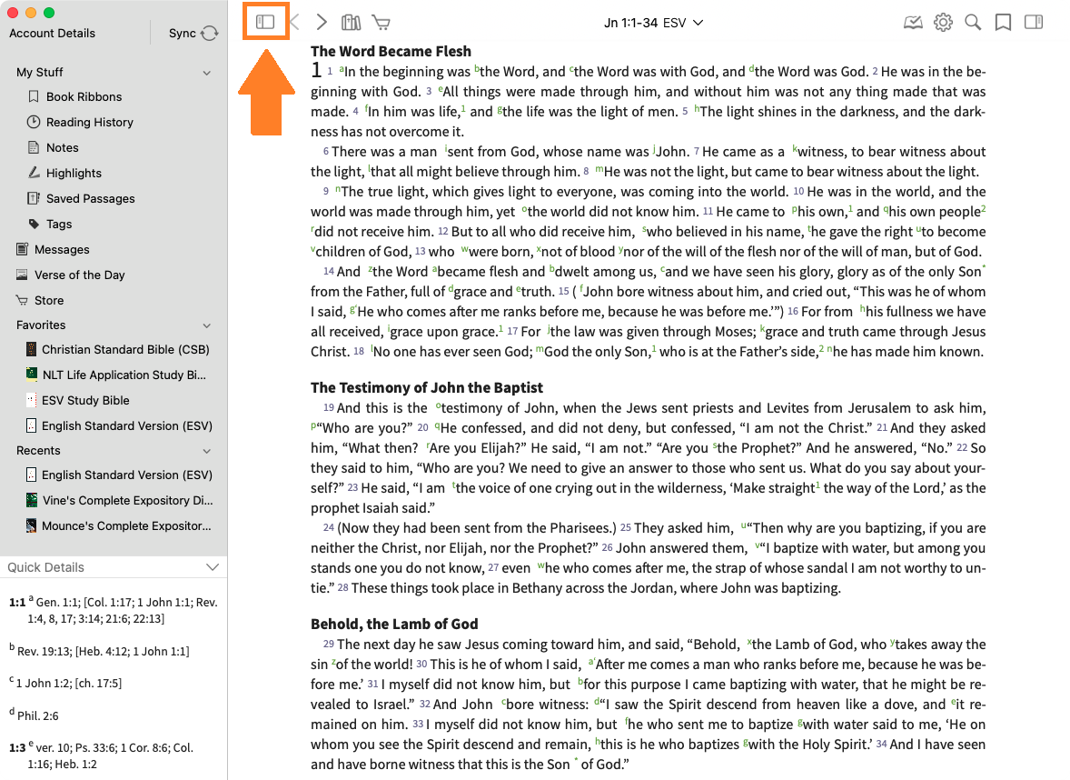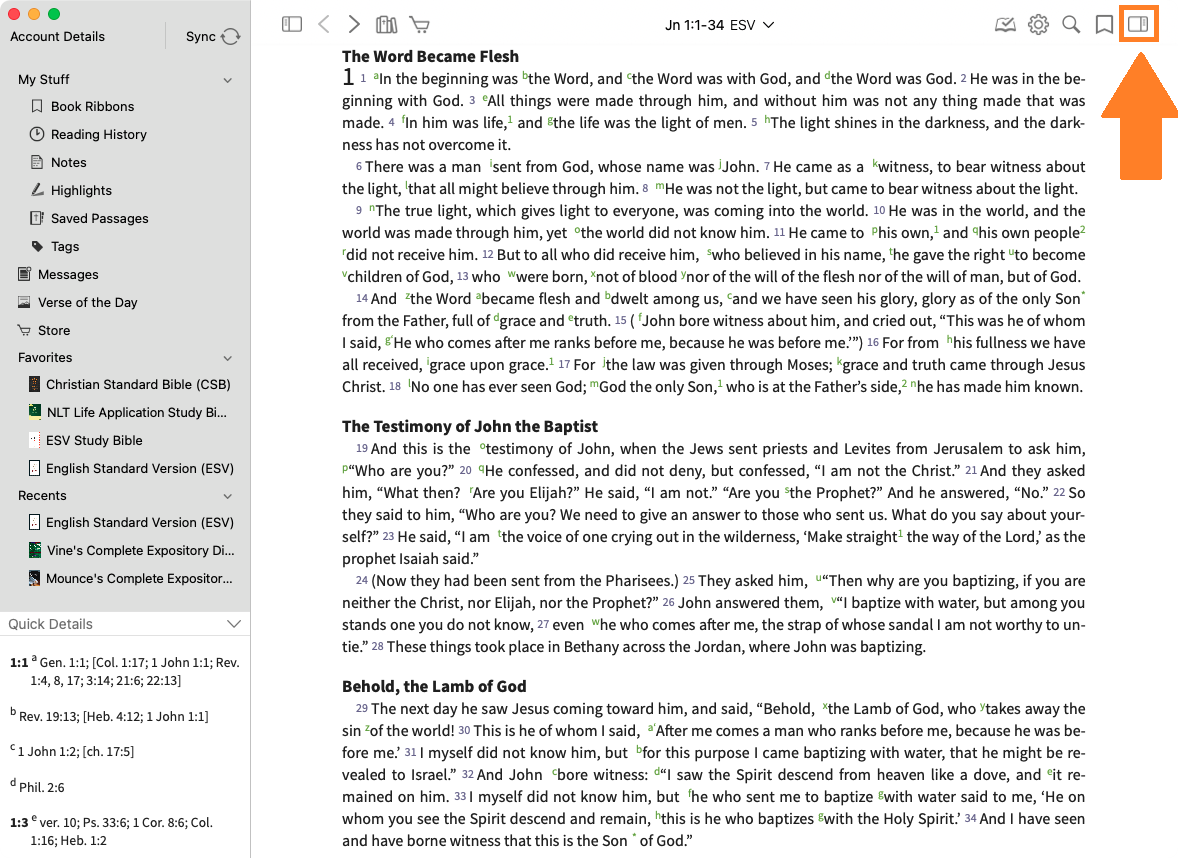 - Select the verse reference to navigate to the linked text in the main window.